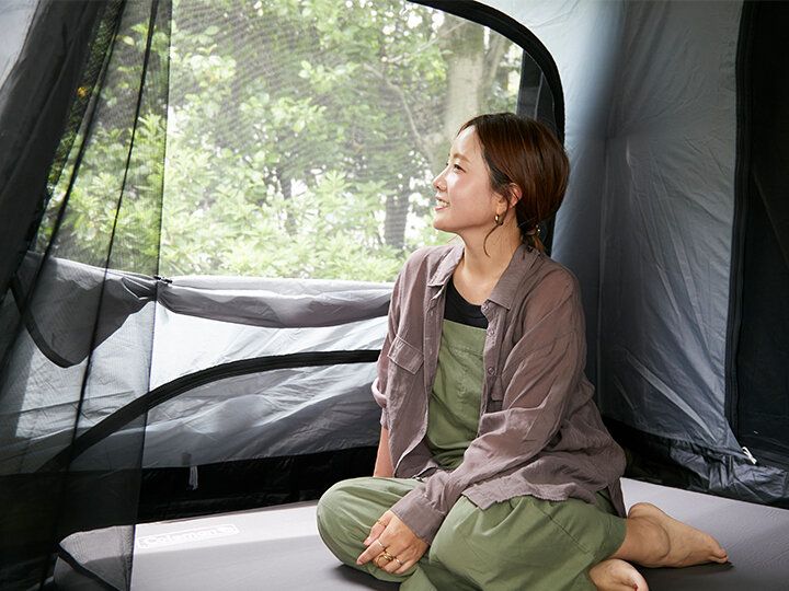 広々リビングに、寝るところはもちろんダークルームテクノロジーを採用。さっそく中に入ってみると…「涼しい~。ホントにヒンヤリします。それにコレ、日光をこれだけ遮るってことは、朝日もまぶしくないですよね。キャンプに来て、朝までゆっくり寝られるってホントに幸せ~」