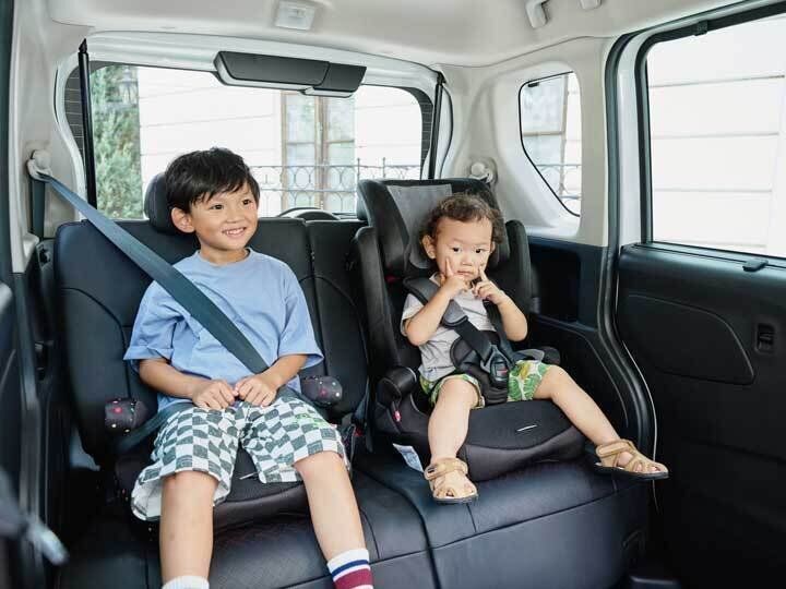 足元にも天井にも余裕があるのが「日産ルークス」の特徴。後席にチャイルドシートを2台並べても、圧迫感がなくゆとりの空間が。