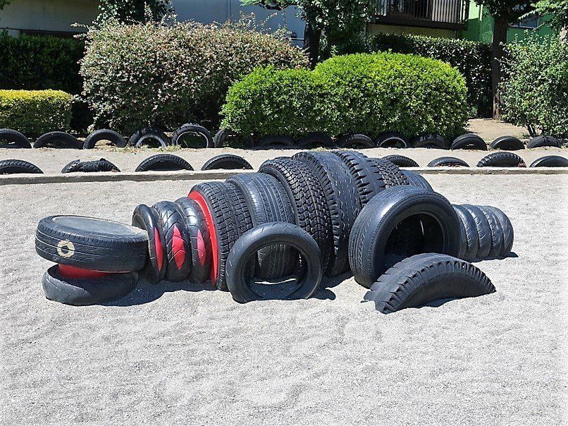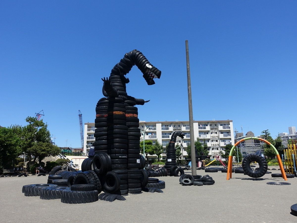 タイヤで作られたロボットや怪獣が公園のあちこちにあります。大人が見るとどう遊ぶのかわからないタイヤの遊具も、子どもは自由な発想で遊んでくれるはず。また、タイヤで作られたアスレチック遊具や幅広のジャンボ滑り台なども人気。いつも、幅広い年齢の子どもたちが遊んでいます。