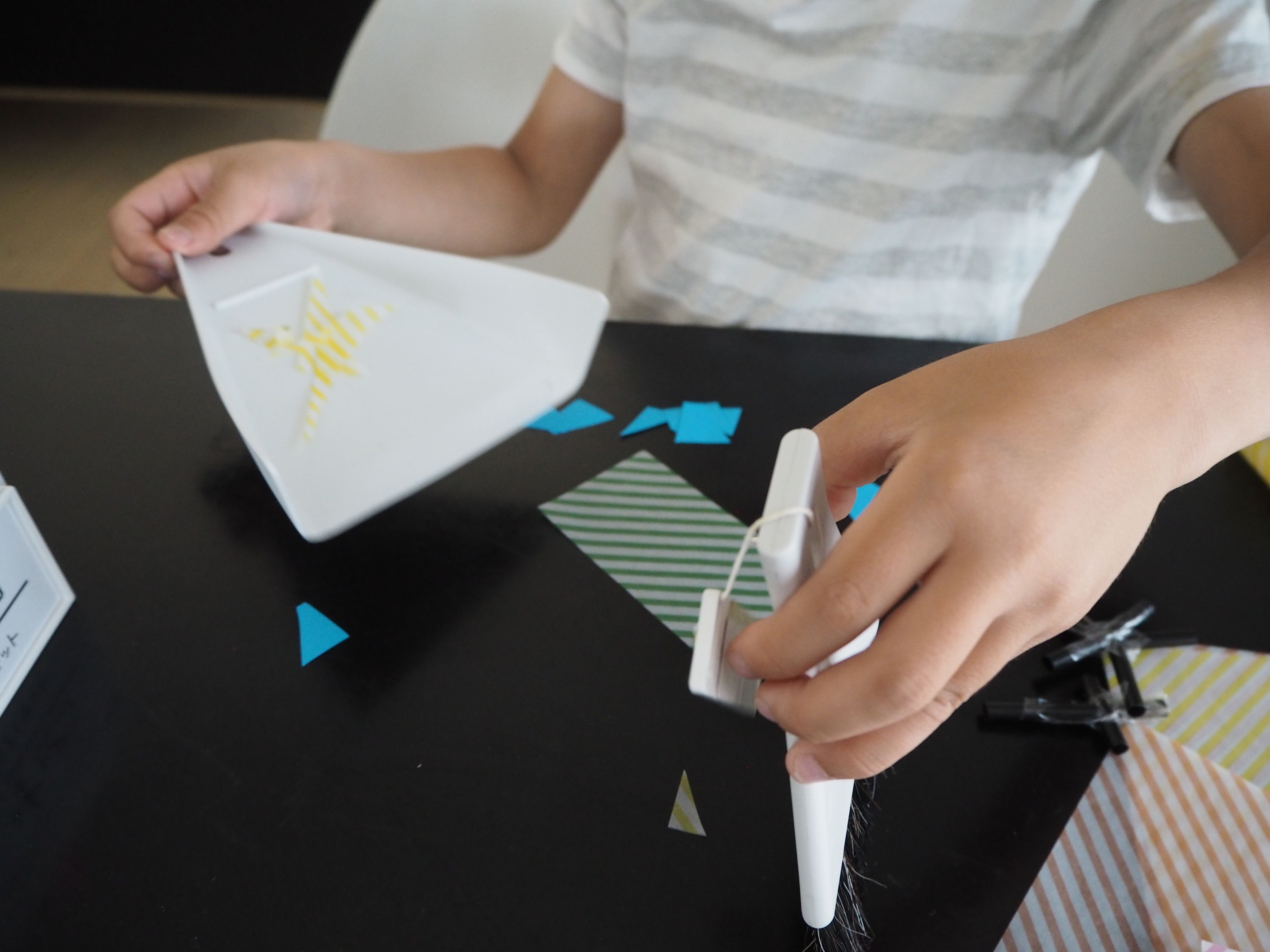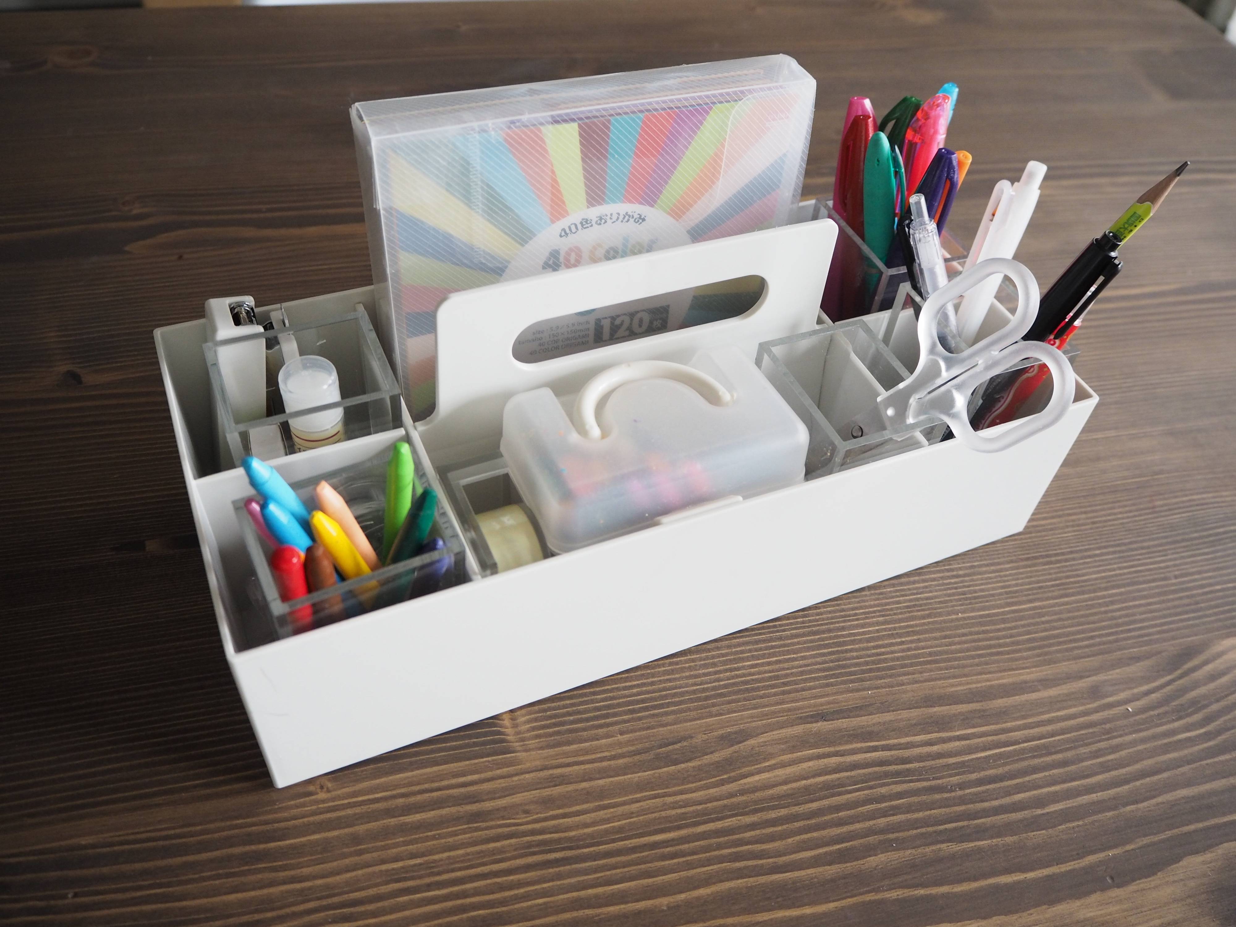 ペンやはさみ、のり、セロハンテープなどはもちろんのこと、折り紙や割りばし、ストローなどの材料もひとまとめに。取っ手がついているので片づけもラクラク。