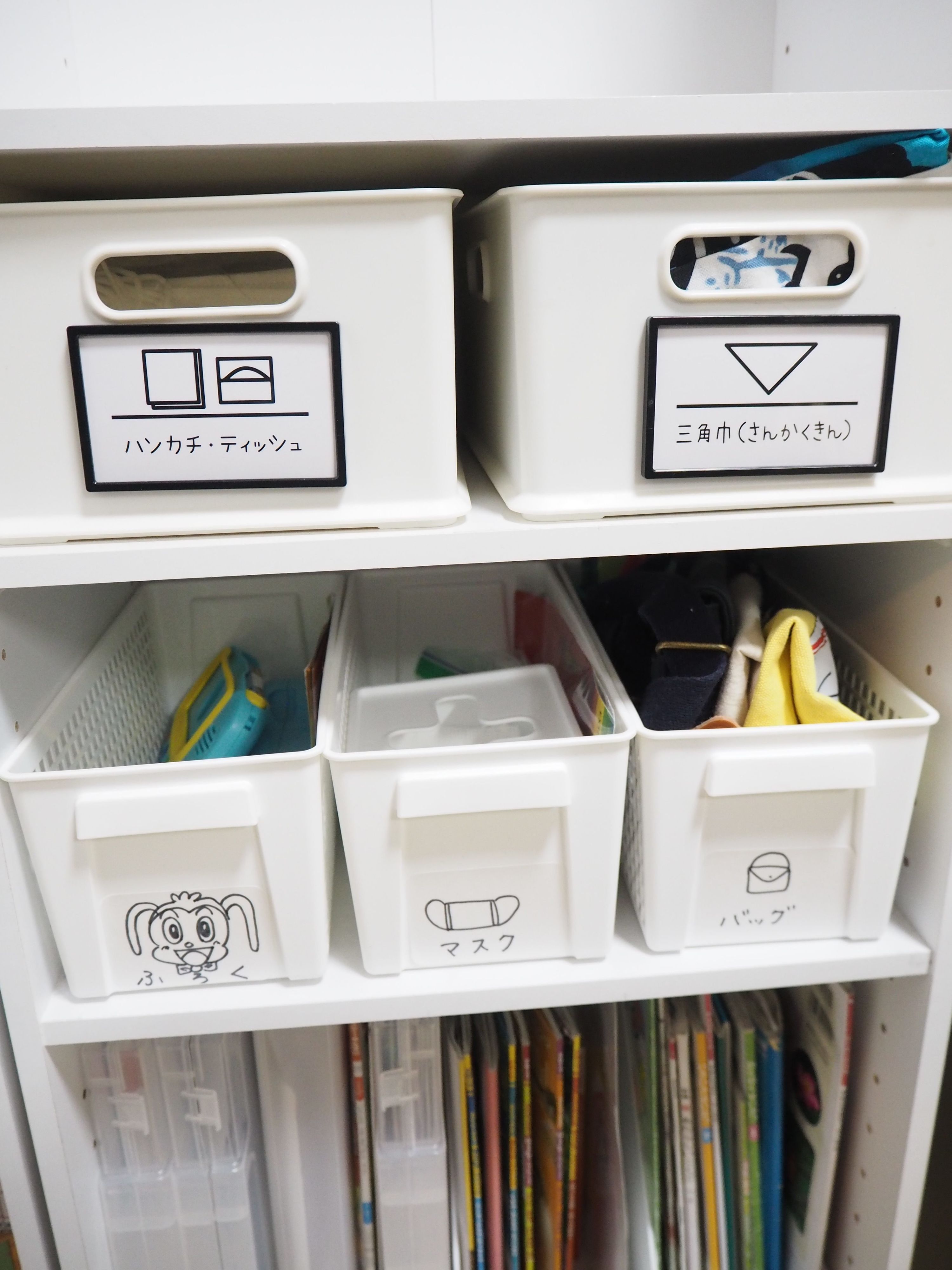 学用品以外にもマスク、ハンカチ、など日常的に使用するアイテムも1カ所にまとめておくことで、子どもが自分で準備しやすくなります。