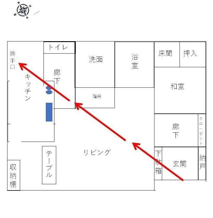 風水では「幸運は玄関から入り、家の中心を通って反対側に進む」と考える。あなたの家の場合、玄関⇒家の中心⇒キッチンがそのラインになっているでしょ。つまり、玄関から入った幸運はまっすぐキッチンに向かう。キッチンは主婦の城。この家の幸運は、あなたが実権を握っているんだね。