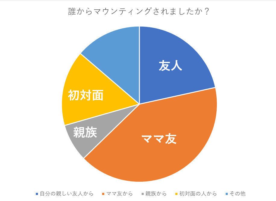 “誰からマウンティングされましたか?”という質問には、「ママ友から」という回答が最も多く、次いで多かったのが「自分の親しい友人から」でした。