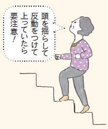 階段を上る際、頭が真っすぐなら正常。前後に揺れている場合は、筋力とバランス力が低下しています。段差で重心をくずすと危険なので、早めに手すりの検討を。