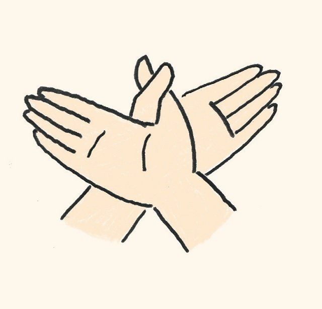 両手の親指どうしを引っ掛けて、影絵の「ハト」の形を作ってもらいます。影絵のキツネはできても、この動作は意外とむずかしく、もし戸惑っている場合は認知症が始まっている可能性があります。