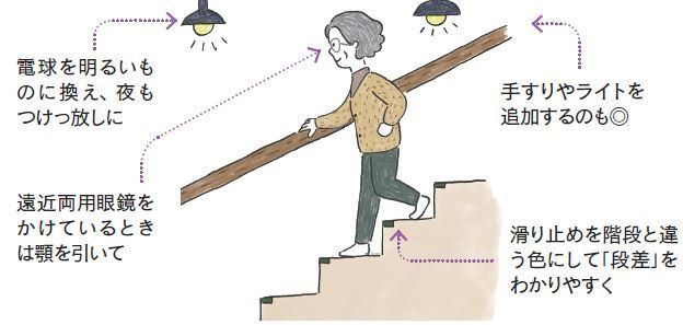 「階段で転ぶと平地の何倍も深刻なケガに!足のつけ根の大腿骨を折って寝たきりにならないよう、左記の対策を」(平松さん)