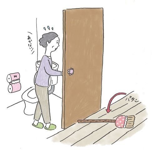 トイレのドアに物が倒れ、出ようとしたらドアが開かない……という事故も。「外に連絡もできず、1人暮らしならだれかが訪ねてくれるまで最悪そのままという事態にもなりかねません。特にほうき、掃除機、傘など倒れやすく長いものが、ドア付近にないかチェックを」(山口さん)