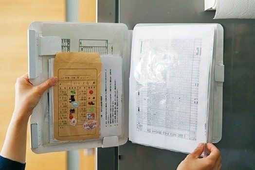 チェック後、提出しなければいけない書類などがあればマグネットつきファイルに移動。よく使う冷蔵庫に貼っておけば見逃しや提出忘れもなくなります。
