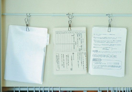 子どもがもらってくるプリント類は登園グッズの収納コーナー内に集合。年単位、月単位、週単位の保管期間ごとに分けてクリップで留め、突っ張り棒に引っ掛けてます。すぐ手に取れるので確認しやすい!