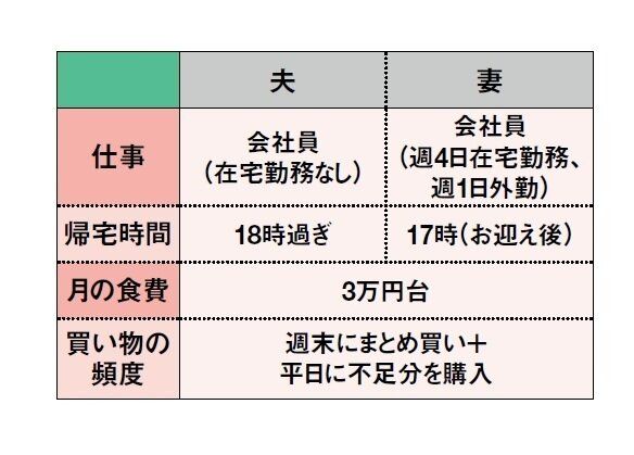 「〇曜日は夫担当」などは決めず、お互いの仕事状況によってその日の担当を決定。「昼ごろLINEをし、帰宅が遅そうなときは妻にお願いします。メニューに迷ったら、相談して決めます」。