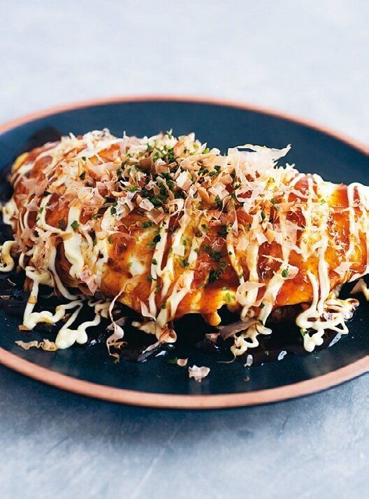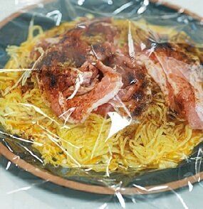 (1)耐熱平皿にラップを大きめに敷き、卵2個を割って溶く。その上にせん切りキャベツ1~2枚分、焼きそば1個(袋の口を1か所切り、耐熱皿にのせて電子レンジで約1分加熱してほぐしておく)、添付のソース少々、豚こま切れ肉50gをのせる。 (2)上にラップを掛けて、電子レンジで6分加熱する(肉に火が通っていなければ再加熱)。ラップを取って半分に折りたたみ、お好み焼きソース、マヨネーズ、青のり、かつお節各適量をかける。