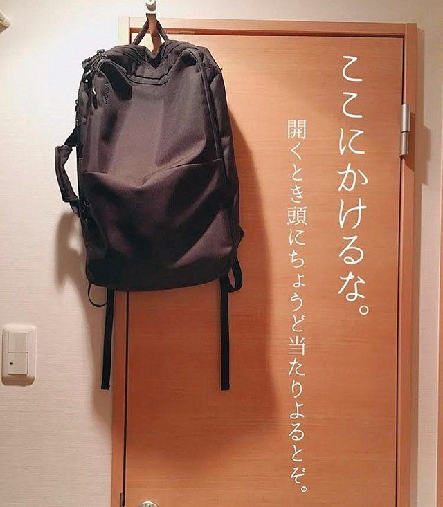 「ふだんは玄関に置いておく通勤用リュック。この日は底を汚したので、床が汚れないようにトイレのドアフックに掛けたそう。気をつかってくれたのはうれしいけれど、トイレに入るときに邪魔かな~(笑)」(gomi_sutero さん)