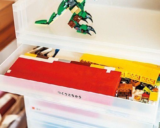 「ブロックを片づけるとき、作りかけの『作品』をどうするか悩むもの。無理やり撤収するのはやめて、途中の物専用の引き出しをつくったら、自分から大切そうにしまうようになりました」