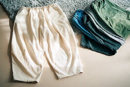 神戸のブランド「オローネ」のパンツ。生地と色違いで5本ある。今はやせて見えることより着心地のよさと「私に似合う」ことを優先