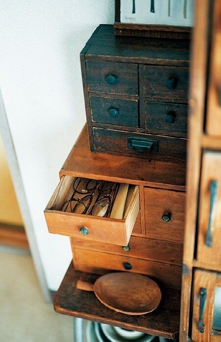 部屋には愛する古道具がそこここに。でも持ち物はそれほど多くありません。「転勤族で引っ越しが多く、50代になって好みがよりはっきりしてきたせいかな。これからもむやみに増やさず、今ある物を大事にして一緒に年を重ねたいです」。