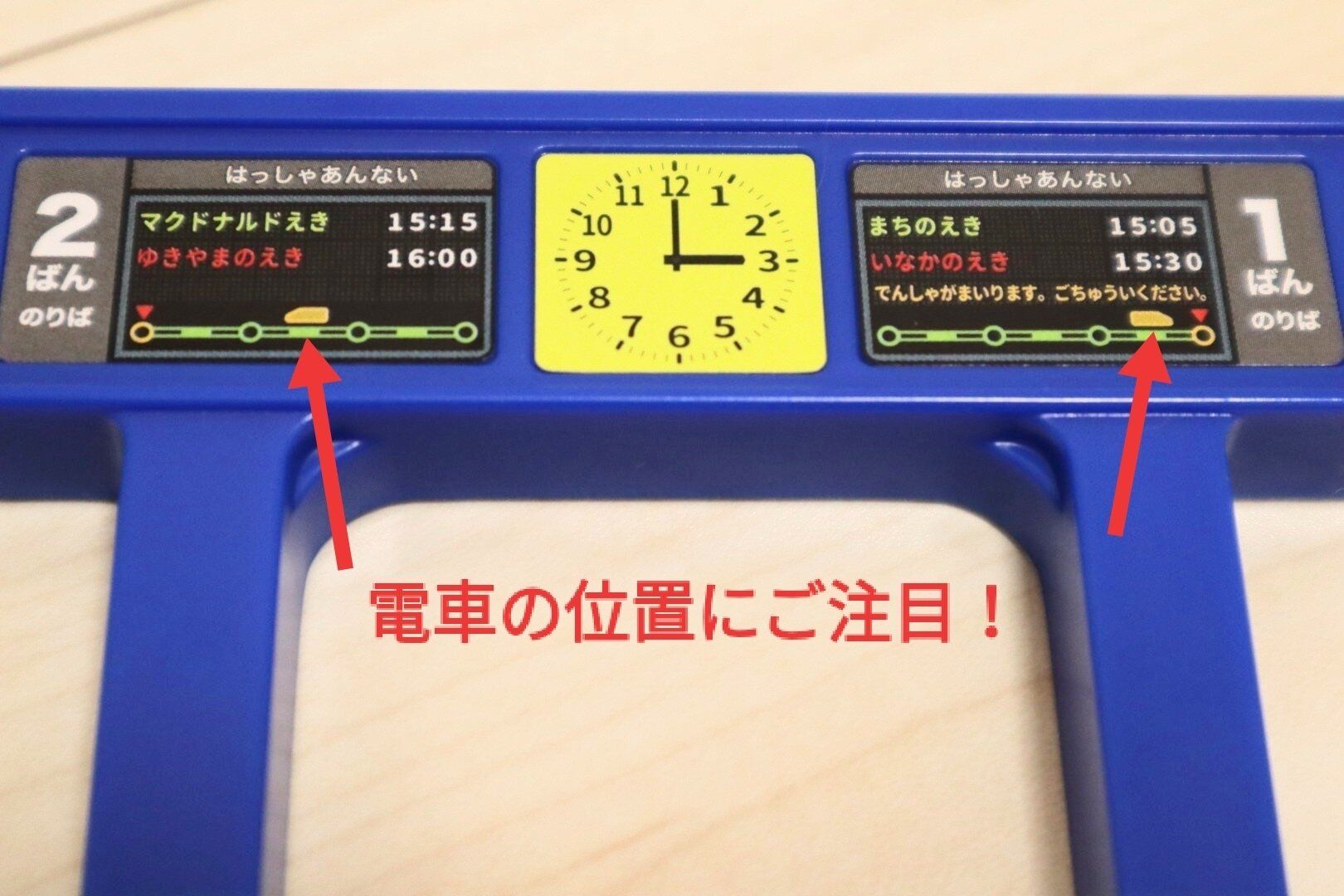 続いてのニヤリポイントは、山手線とセットになっている発車標です。架空の駅名、時刻が再現されているのはもちろん、到着する予定の電車が今いる位置までが忠実に再現されています。