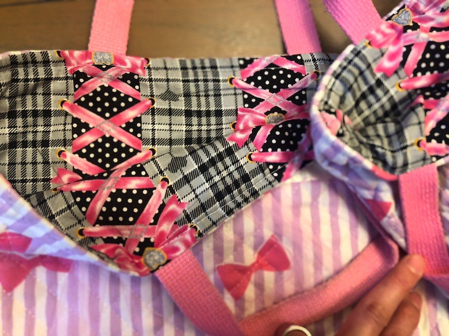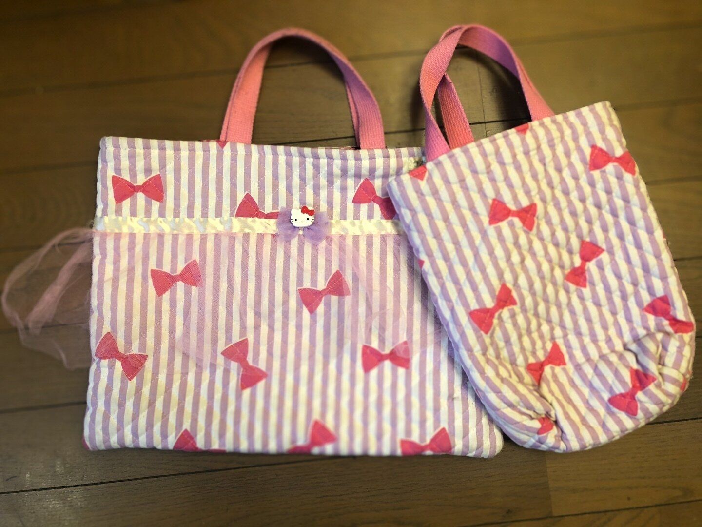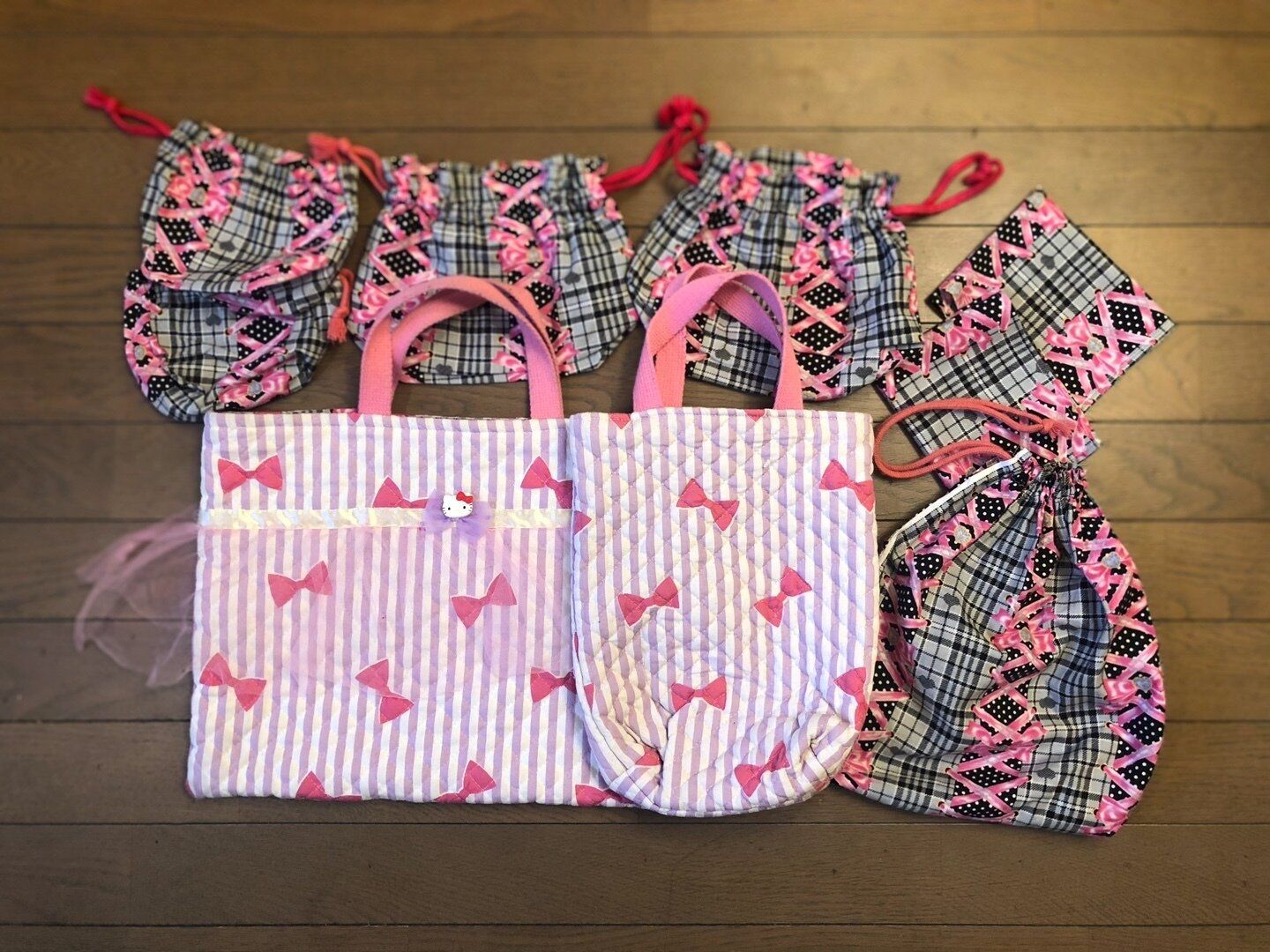 手提げ袋と上履き袋です。出し入れをしやすいように上履き袋を少し大きめに作り、普通の手提げのような作りにしました。こちらの娘の希望は、「キティちゃんのリボンぽい感じ」とのことで、リボンのモチーフ柄を使用しました。リボンが好きですね(笑)
