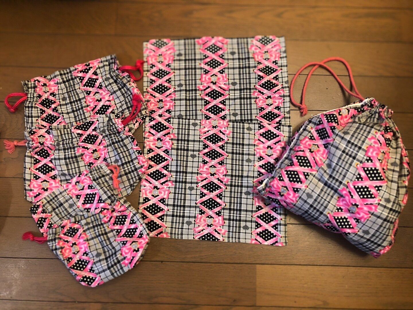 私としてはもう少しシックな柄の方がいいかなあ?と思いましたが、ここは全面的に娘の希望を採用。娘の幼稚園では、お弁当袋、コップ袋、ランチョンマットを2枚ずつ、着替え袋を1枚用意する決まりでした。