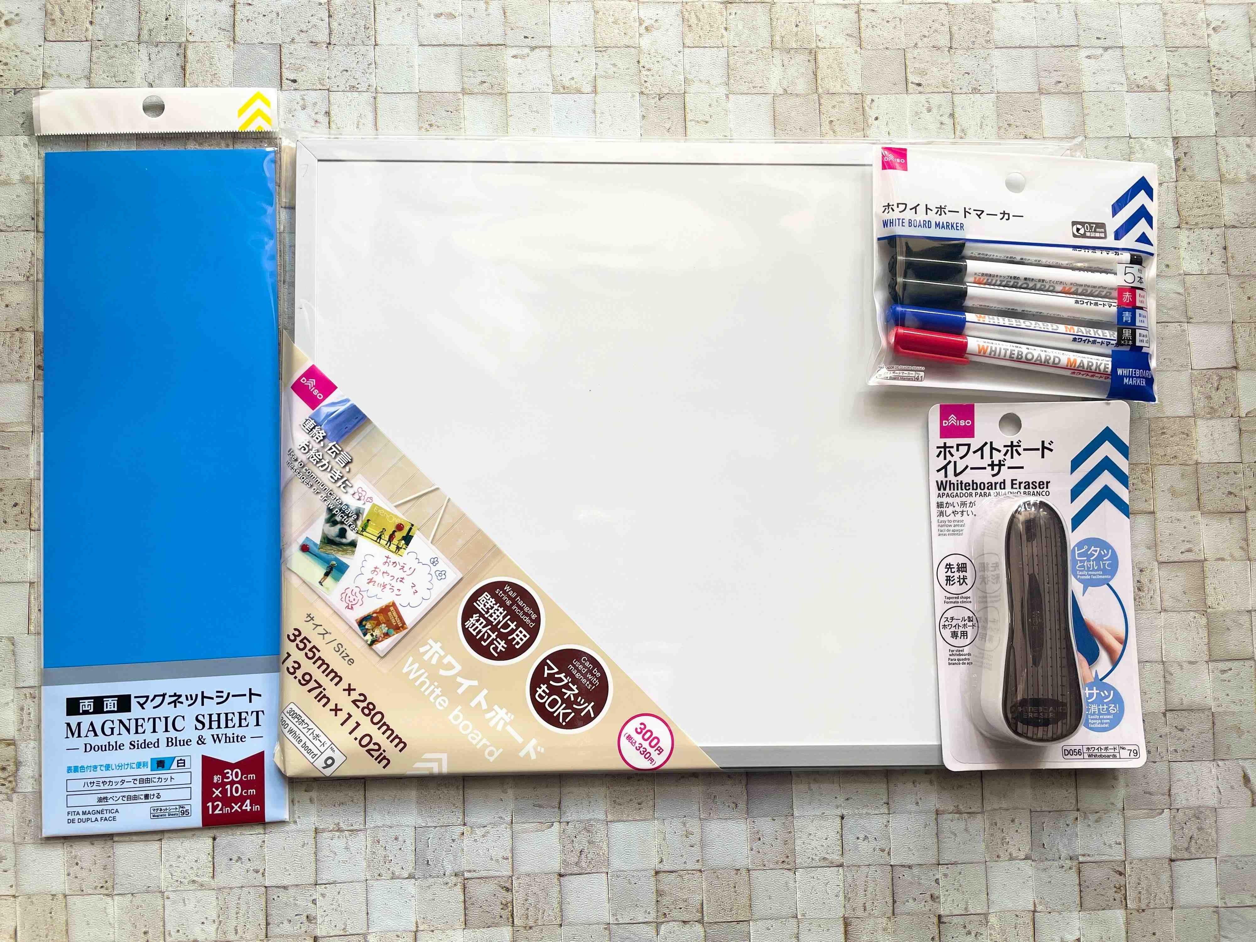 まずは、マグネットが付けられて壁掛けヒモ付き330円の「ホワイトボード」。そして、3色5本入りホワイトボードマーカー110円、ホワイトボードイレーザー110円。両面マグネットシート(青/白)110円です。