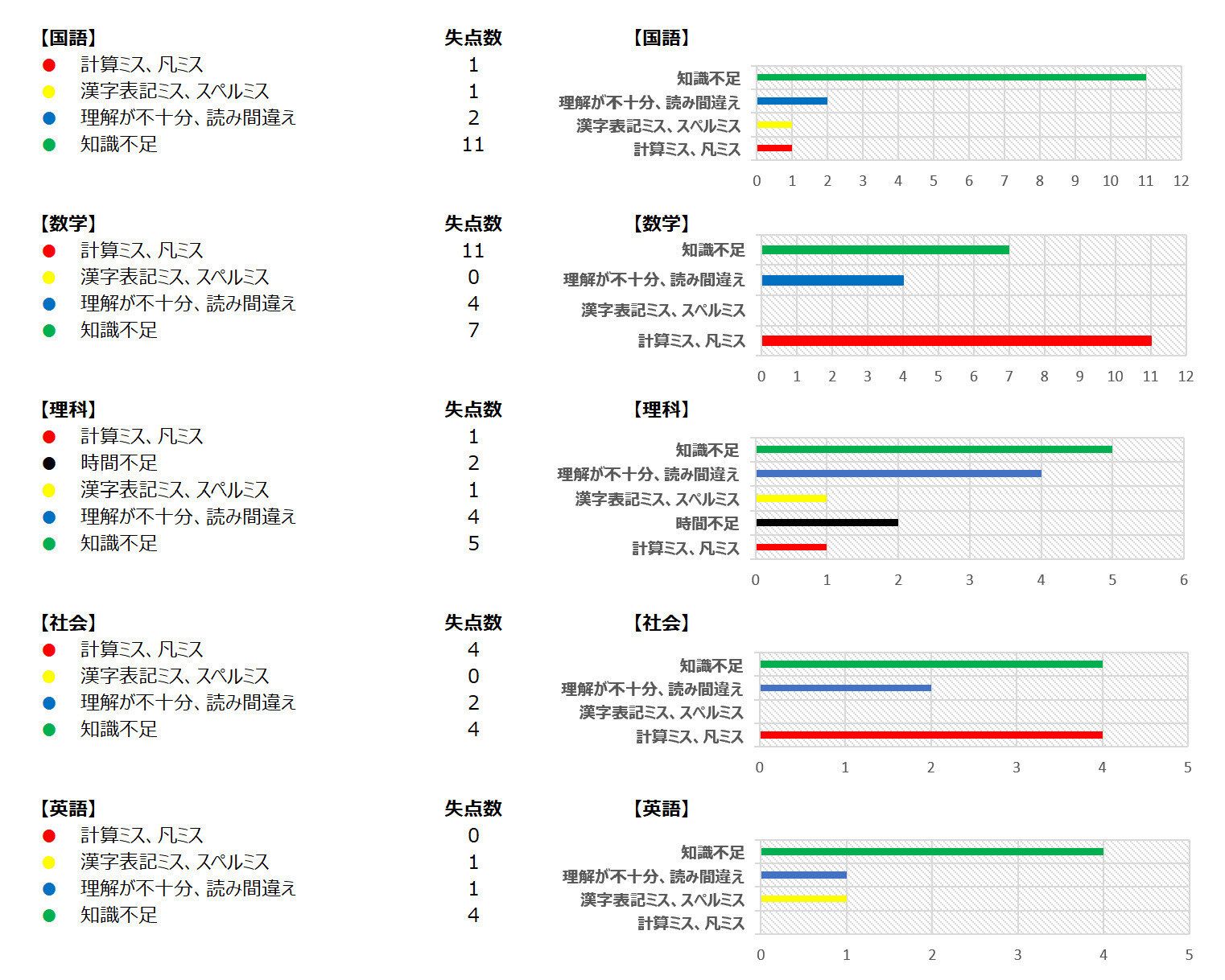 その要因をシンプル化させるために失点を4つに分類してみました。分類:①計算ミス、凡ミス ②漢字表記ミス、スペルミス ③理解が不十分、読み間違え ④知識不足