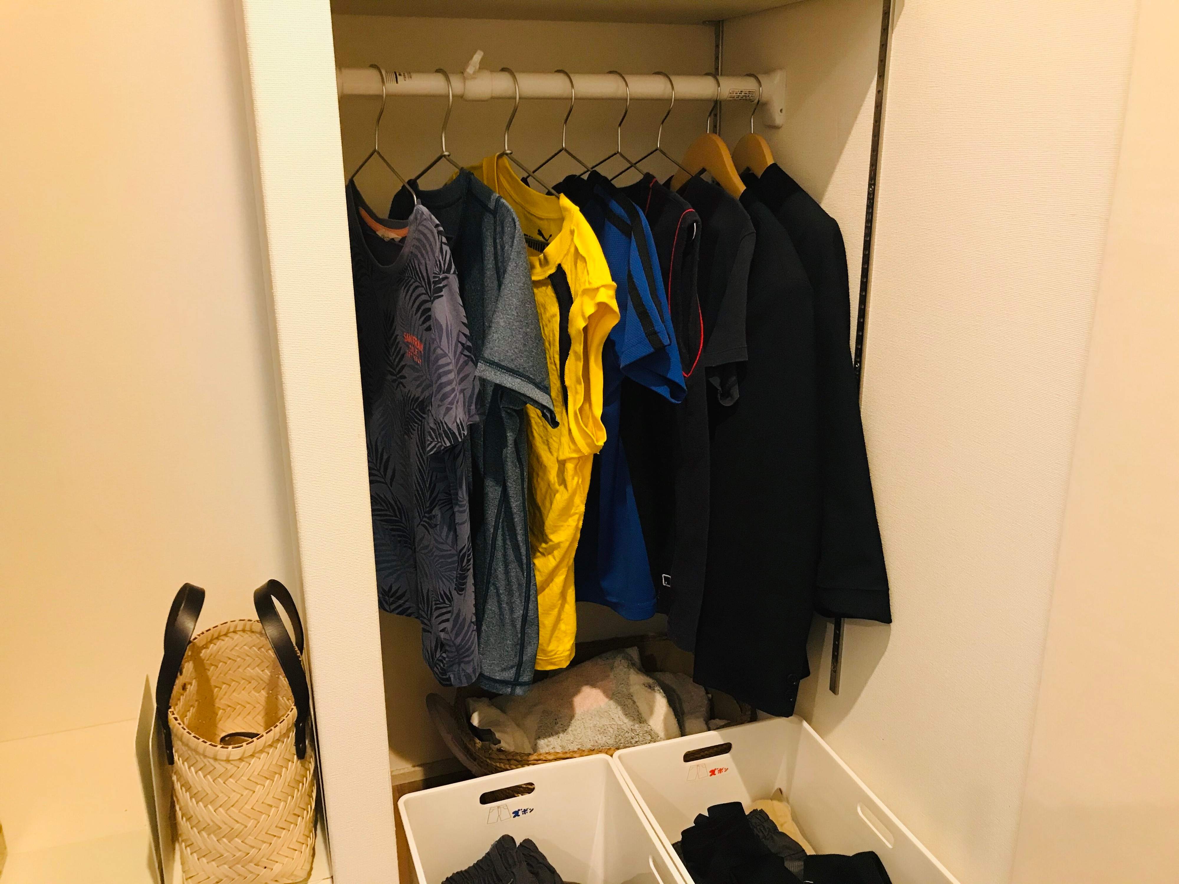 洋服の枚数も決め、アウターは吊るし、ボトムスはボックスに入れるだけにしています。
