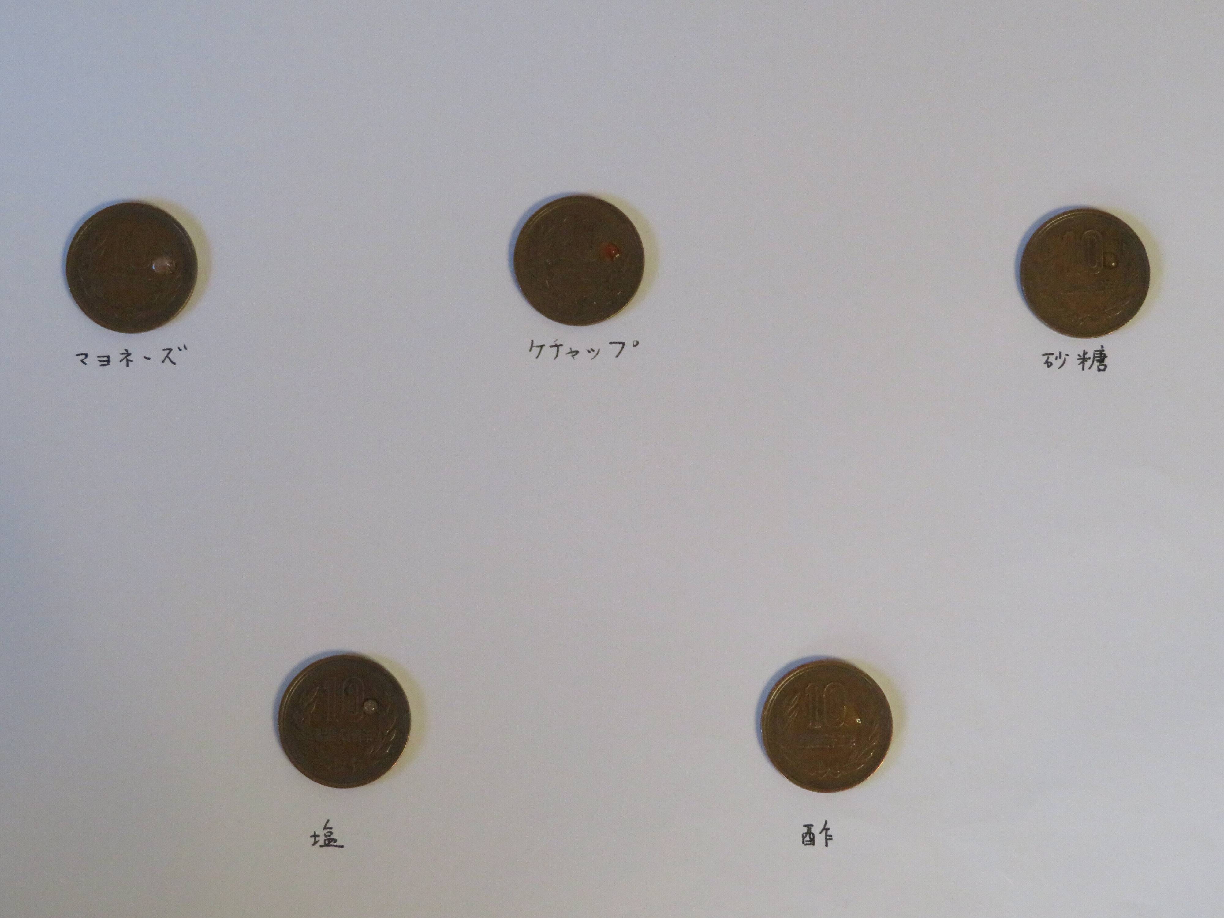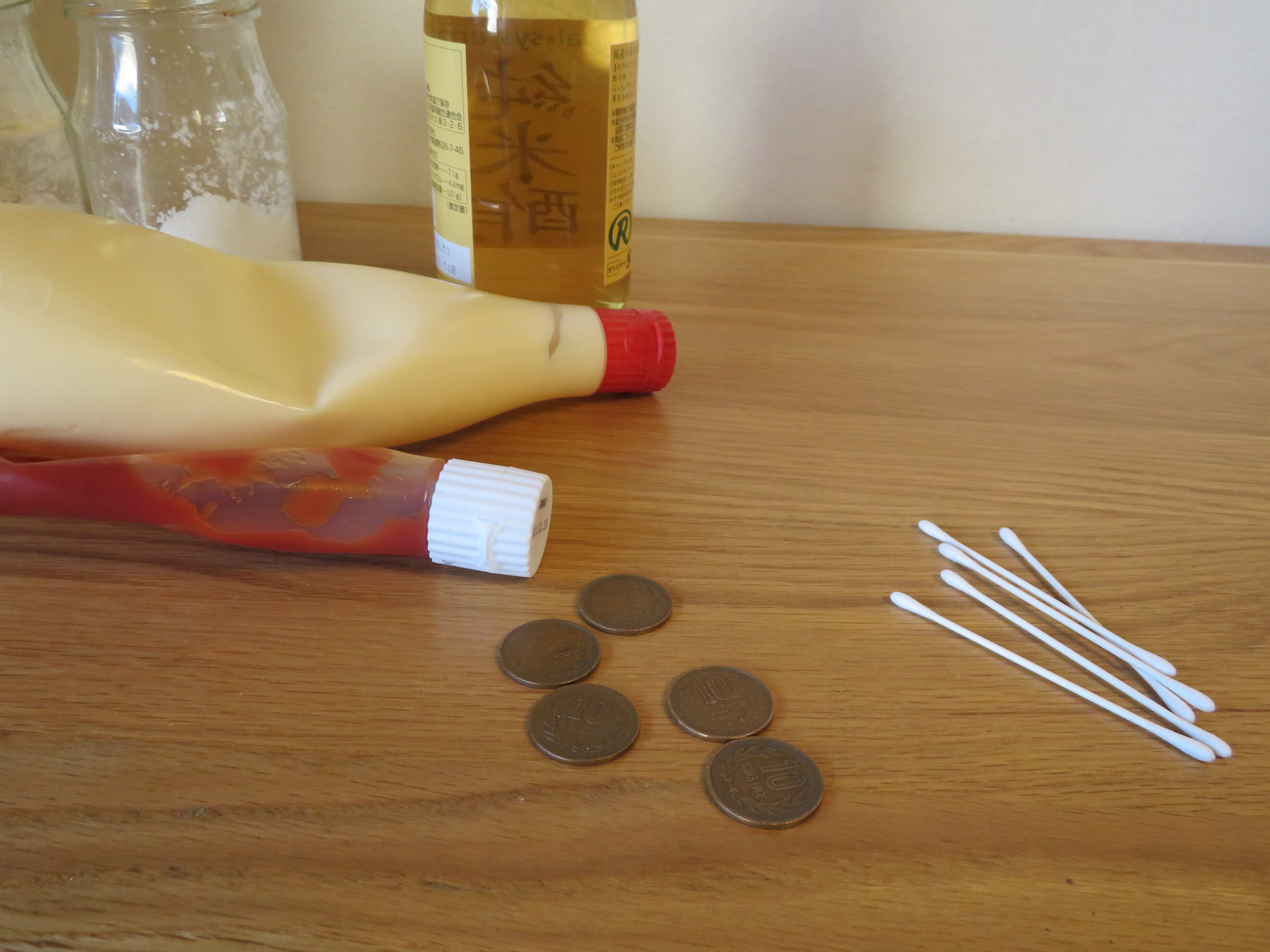 用意するのは、錆びて茶色くなった十円玉数枚、綿棒、ケチャップなどの調味料。