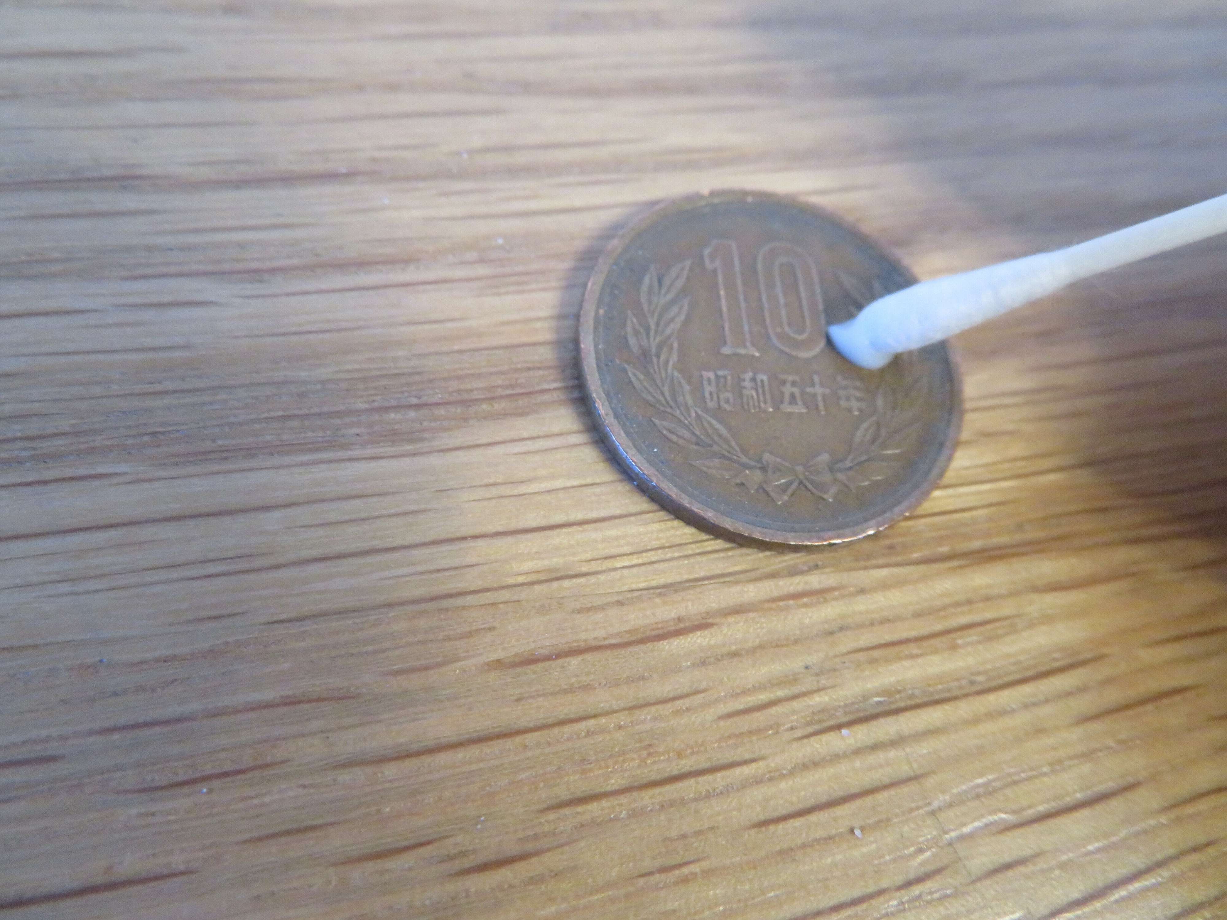 乾かした後、綿棒に調味料を少しだけとり、十円玉の上に塗ります。