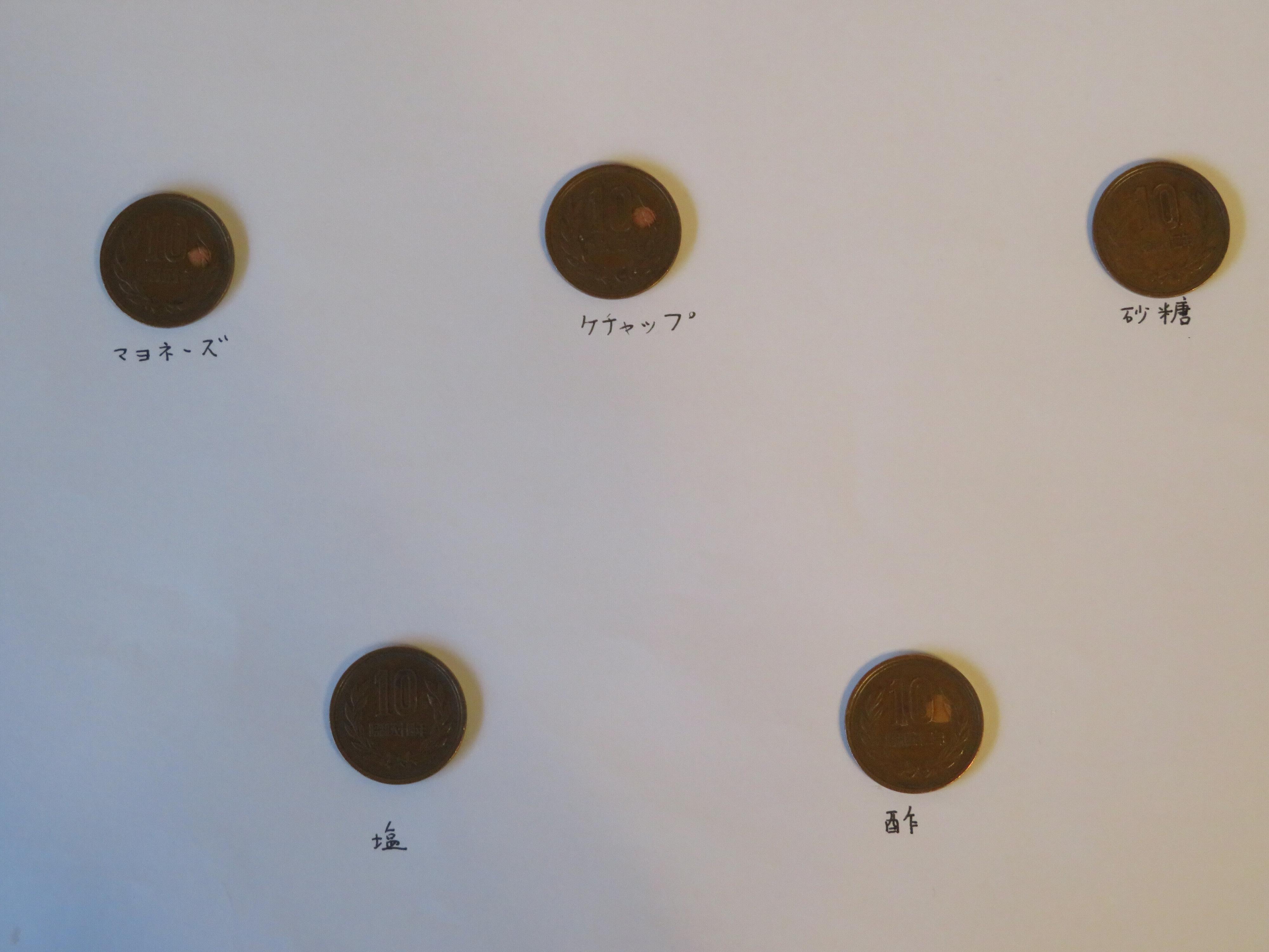 今回試したのは、マヨネーズ、ケチャップ、砂糖、塩、酢。