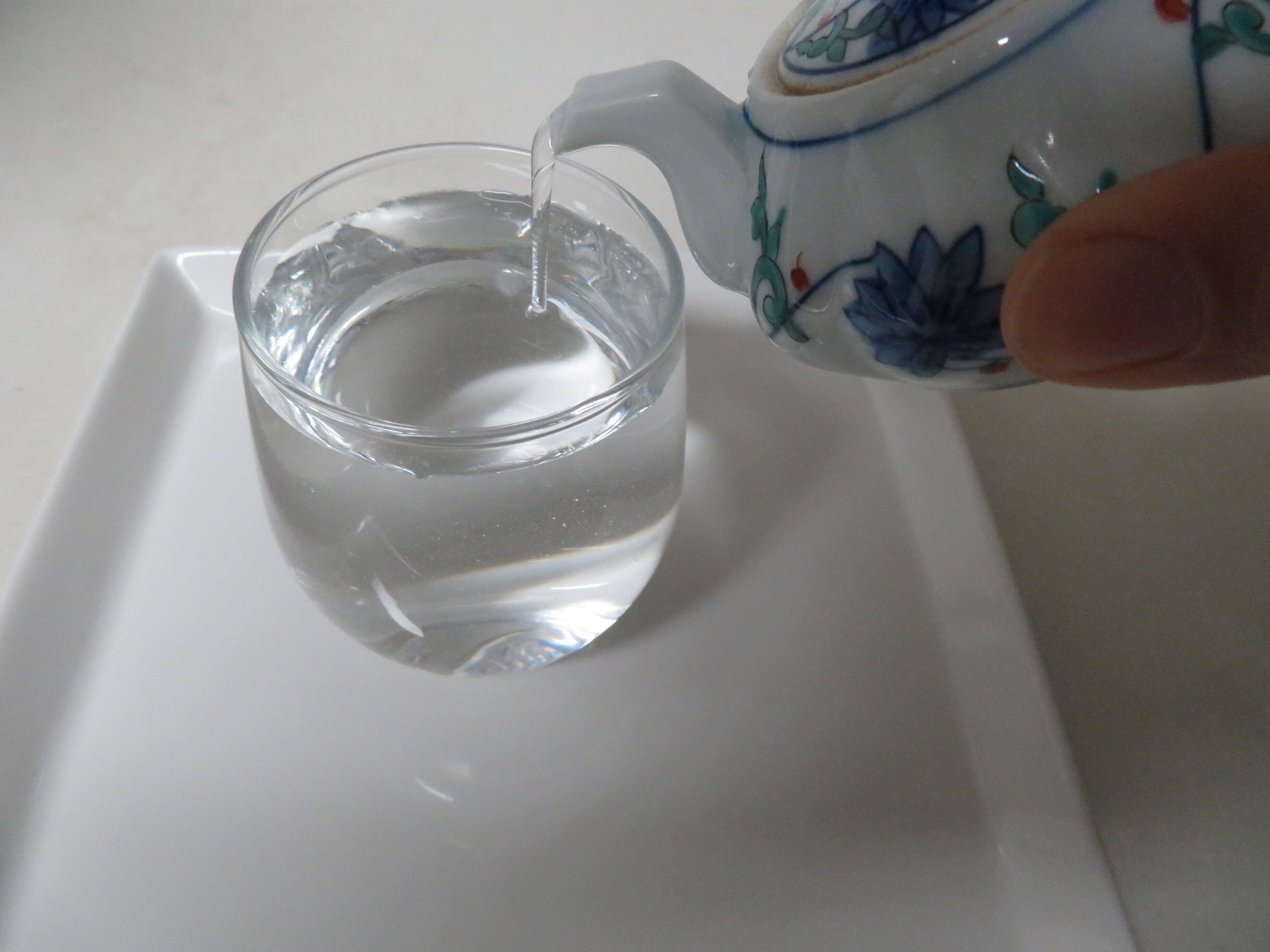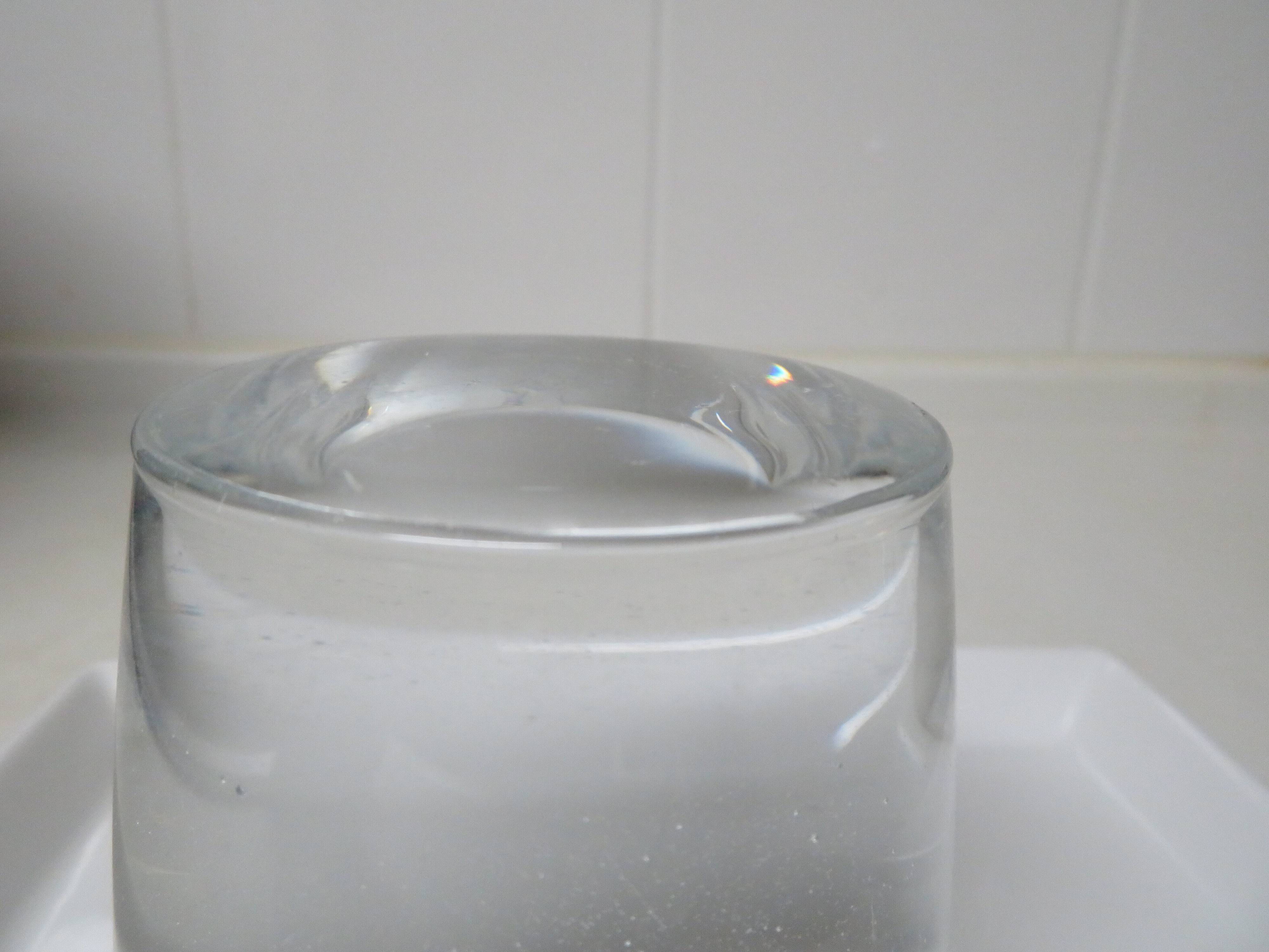それからしょう油さしなどでコップのふちぎりぎりまで水を注いでいきます。