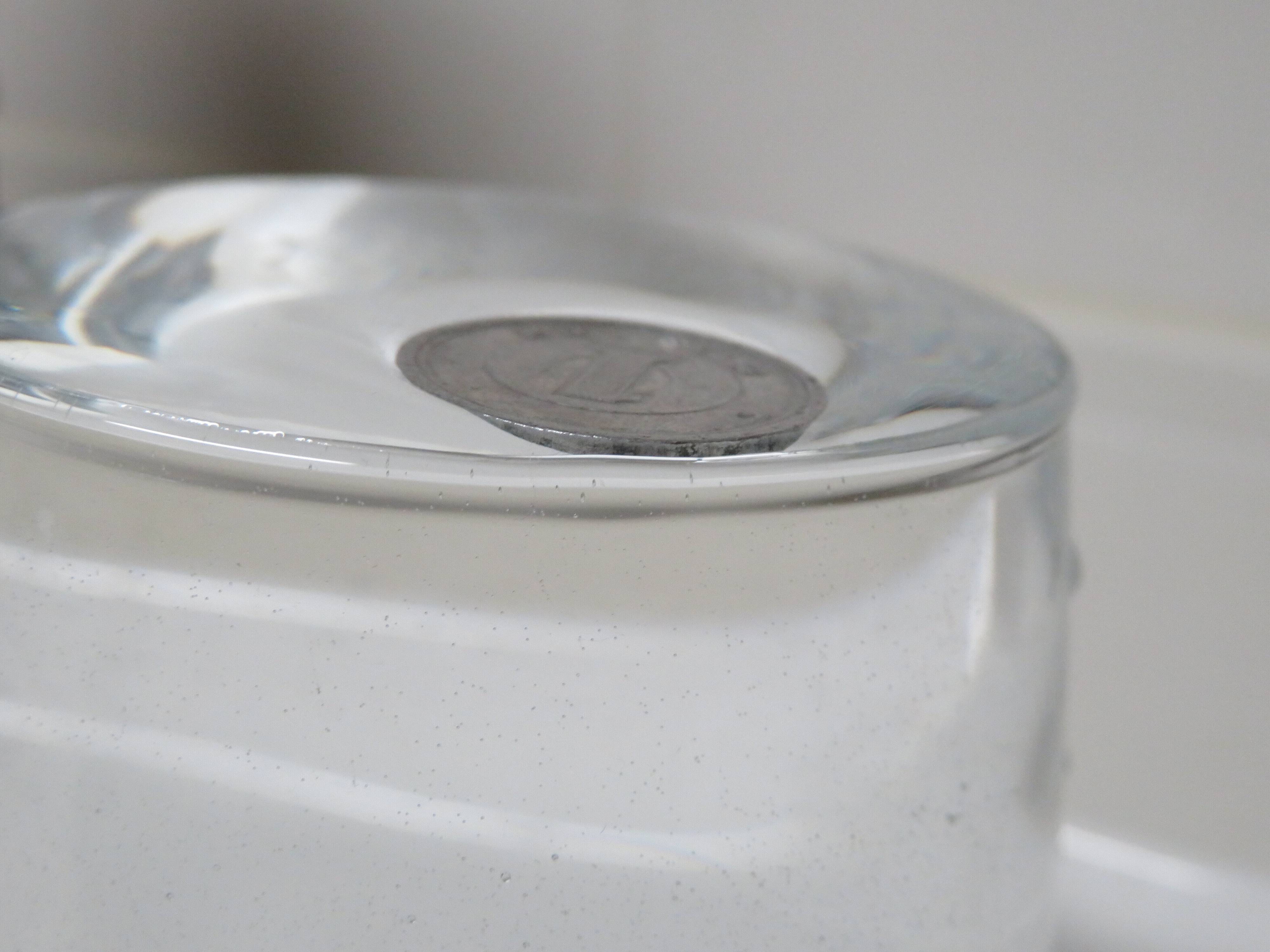 その水面に、一円玉を水平にしてすべらせるように置きます。