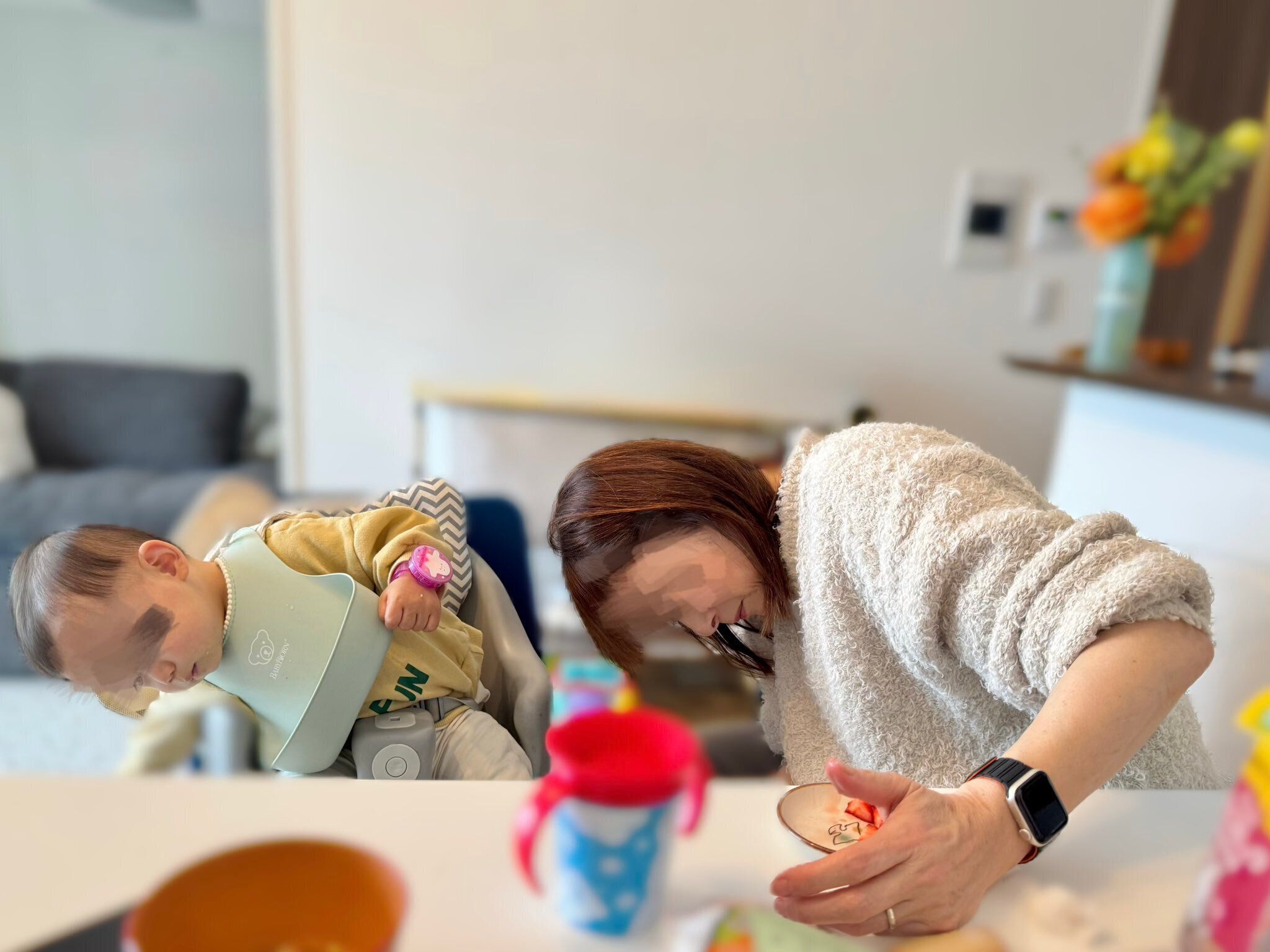 「ちょうどお昼ごはんを食べているときでした。息子がごはんを豪快にこぼしてしまったので『身動きがとりにくい椅子に座らせている今がロボットを動かすチャンスだ!』と思い、お掃除ロボットを稼働させました。(床にいるとロボットをさわりに行ってしまうので)すると息子だけでなく私の母まで興味深そうに眺めている姿が面白くて、写真を撮ったところちょうどシンクロした姿をおさめられました」