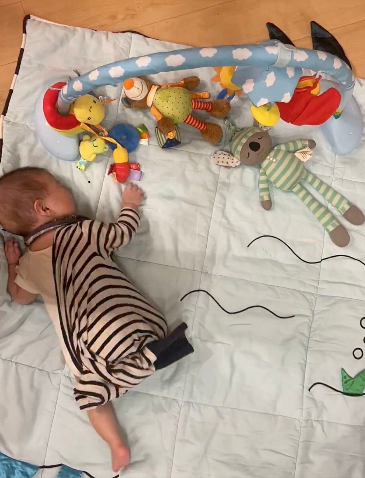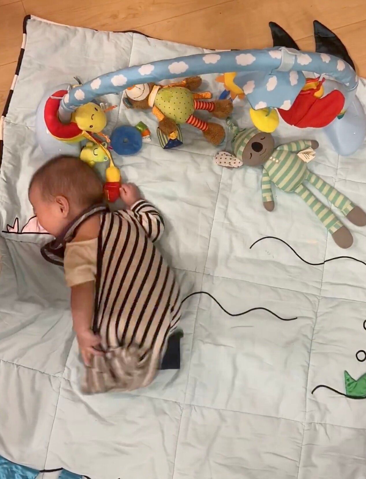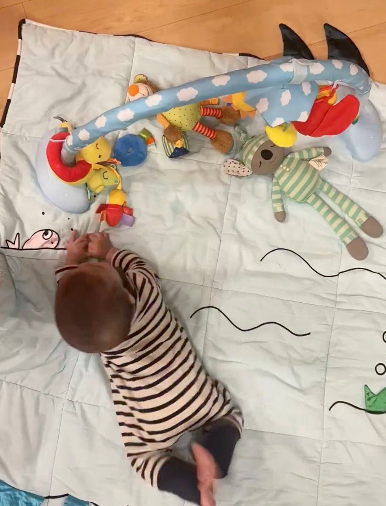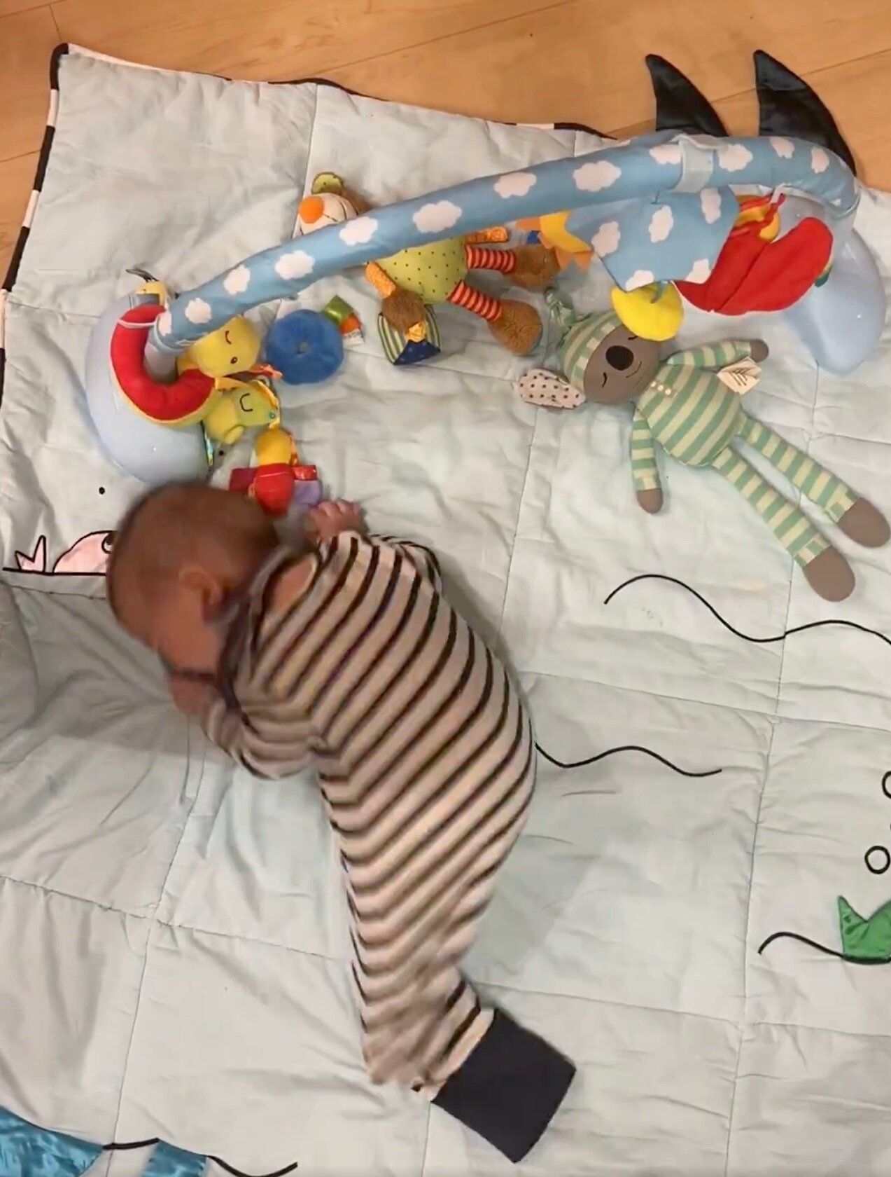 動画には、プレイマットの上でうつ伏せになっている息子くんの姿が映し出されます。