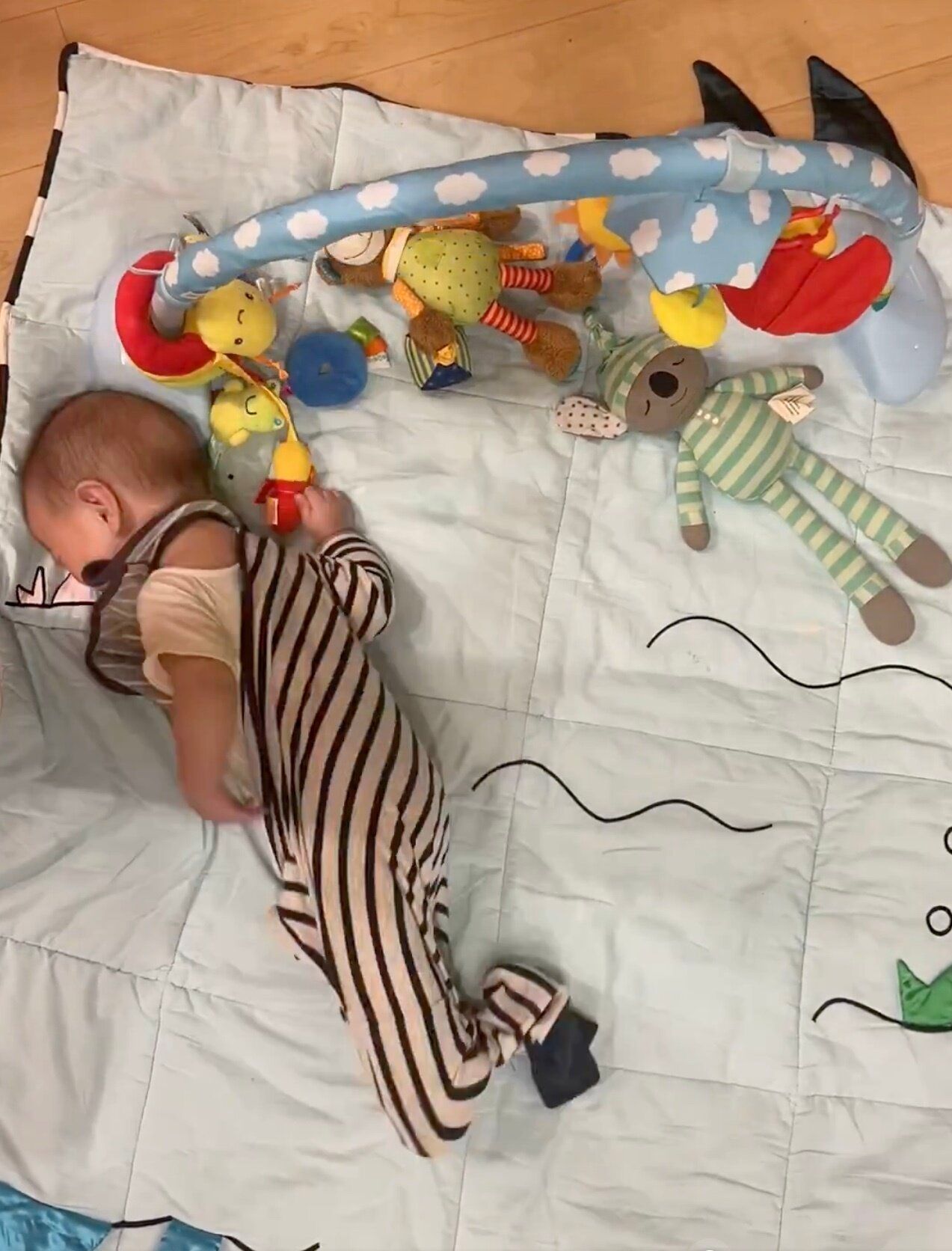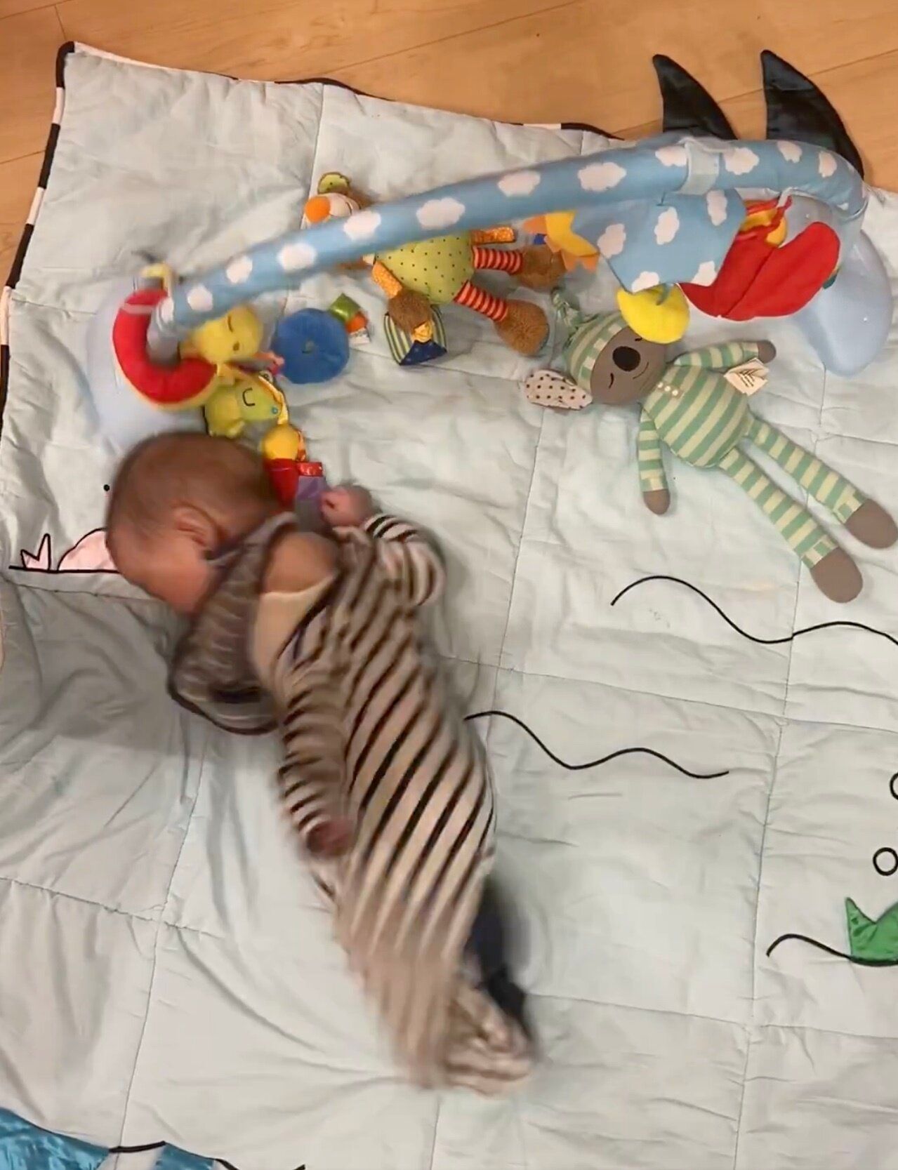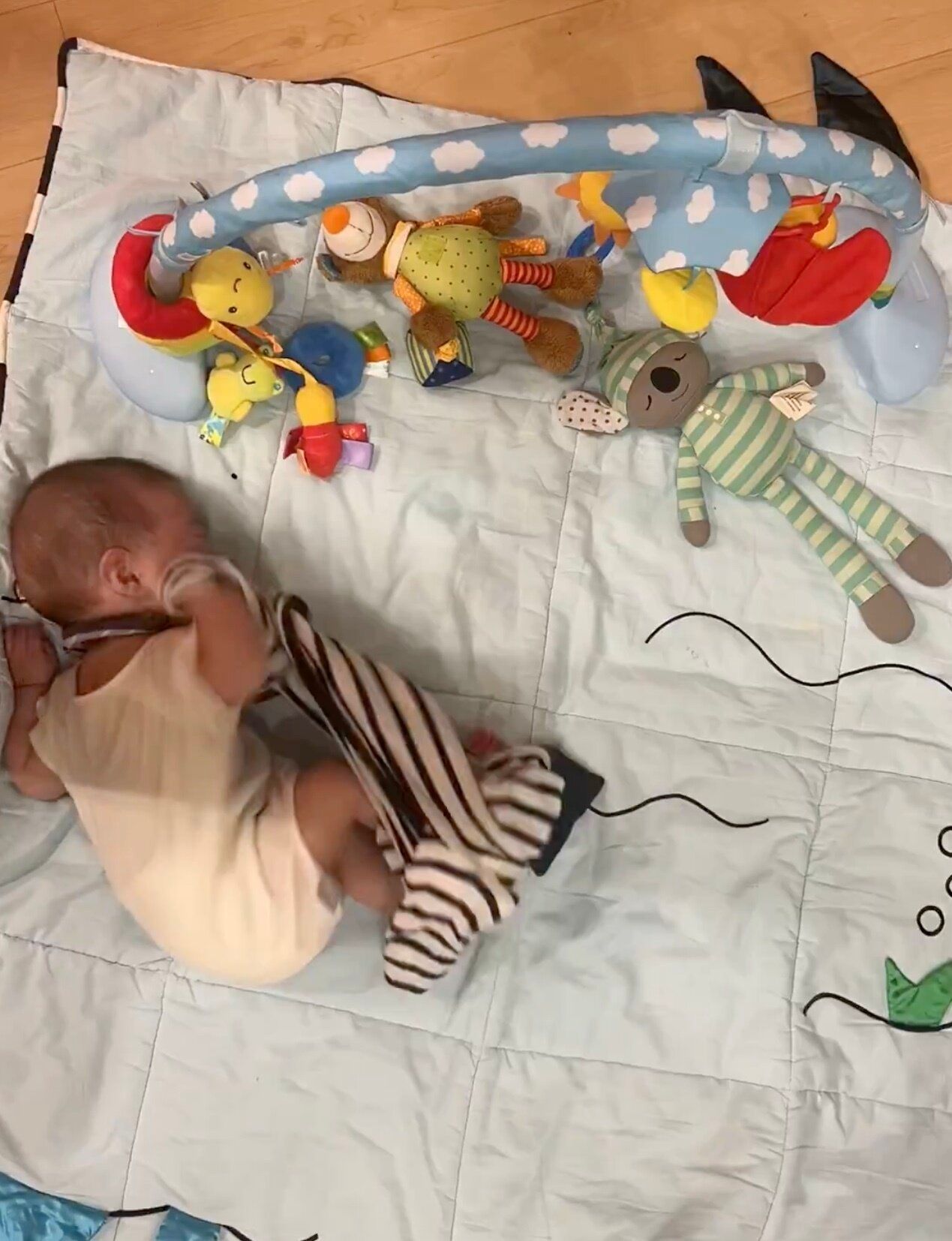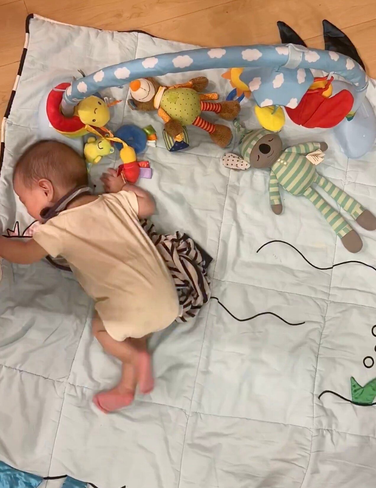 動画には、プレイマットの上でうつ伏せになっている息子くんの姿が映し出されます。
