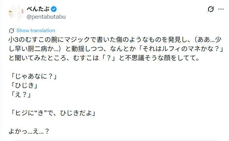 ぺんたぶさん(@pentabutabu)が投稿したのは、小学3年生の息子のおもしろ可愛いエピソードです。ある日、息子の腕を見ると、マジックペンで書かれた傷のようなものが。息子になにを書いたのか聞いてみると、予想外の答えが返ってきたようです。