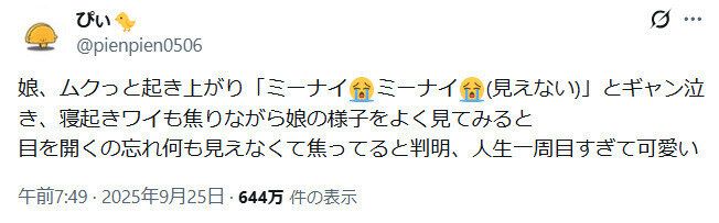 ぴぃさん(@pienpien0506)が投稿した2歳の娘さんの仕草に、「かわいすぎる」と13万件以上のいいねが集まっています。朝、目覚めると「ミーナイ(見えない)」と言って大泣きしていた娘さん。癒やしがたっぷりの、その理由に注目です。