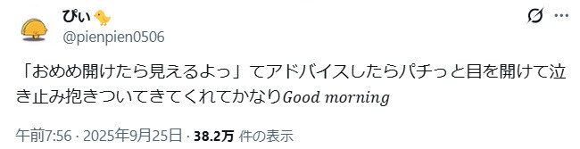 無事にパチっと目を開くと泣き止み、ぴぃさんに抱きついてきたといいます。