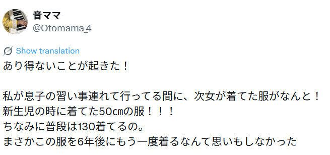 「このベビードレスは、長女、息子、次女が全員着た思い出の服です。また、唯一取っておいた赤ちゃんのときの服でした。次女の洋服スペースの奥に保管しており、ときどき私が見て懐かしく思うことはありましたが、まさかまた着ることになるとは思わず驚きました。この出来事により、さらに思い出が追加されて嬉しいです。より一層大事に取っておこうと思いました」