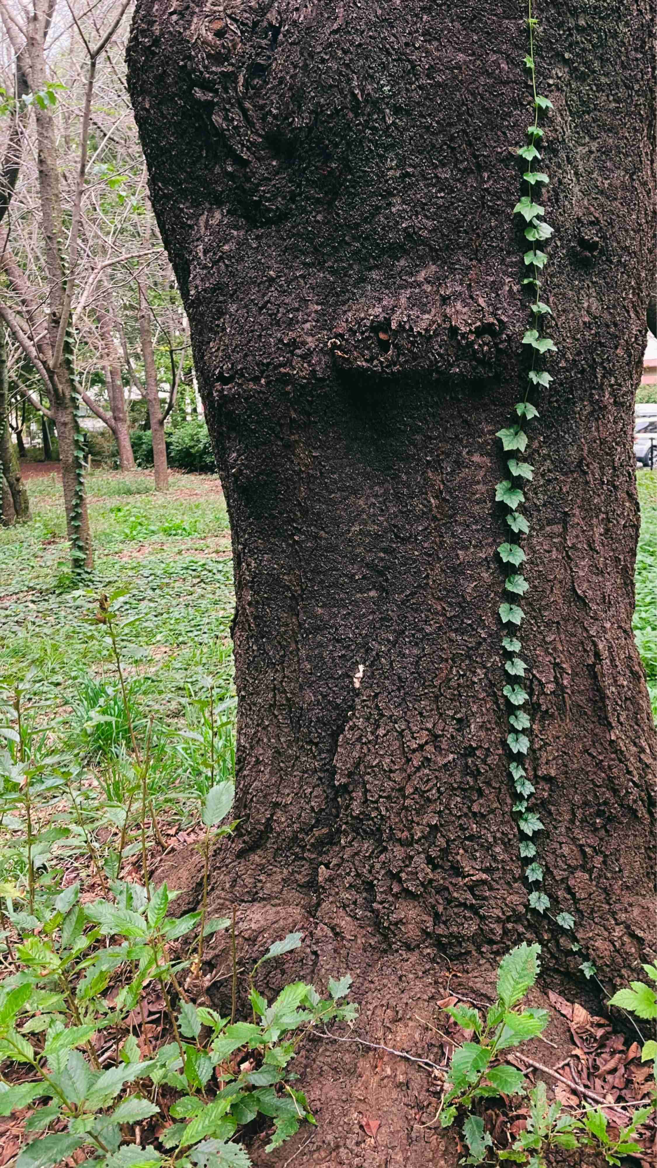 いっしょに公園を歩いているときに、木の幹をつたって小さな葉っぱが一列に生えているのを見つけたのだそう。