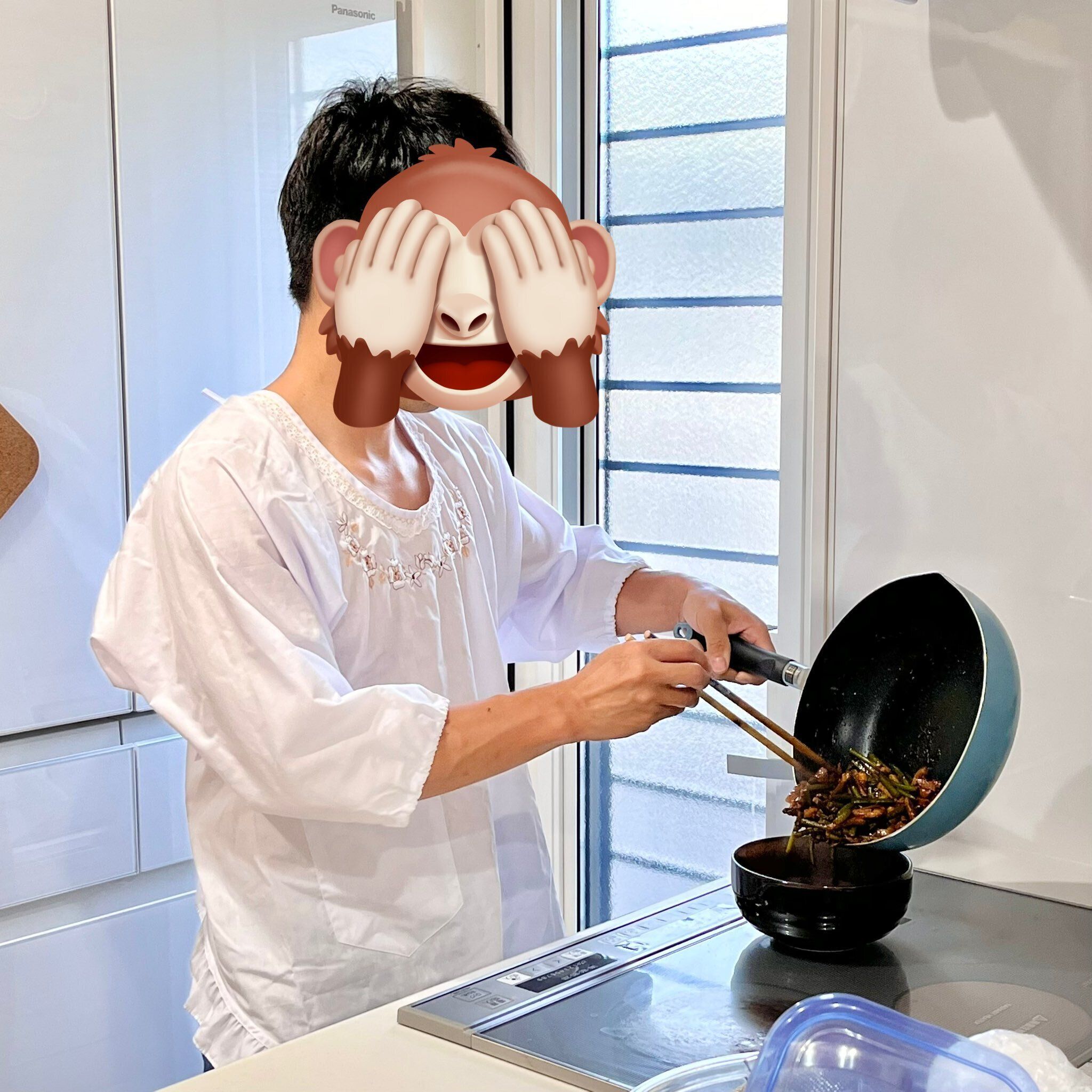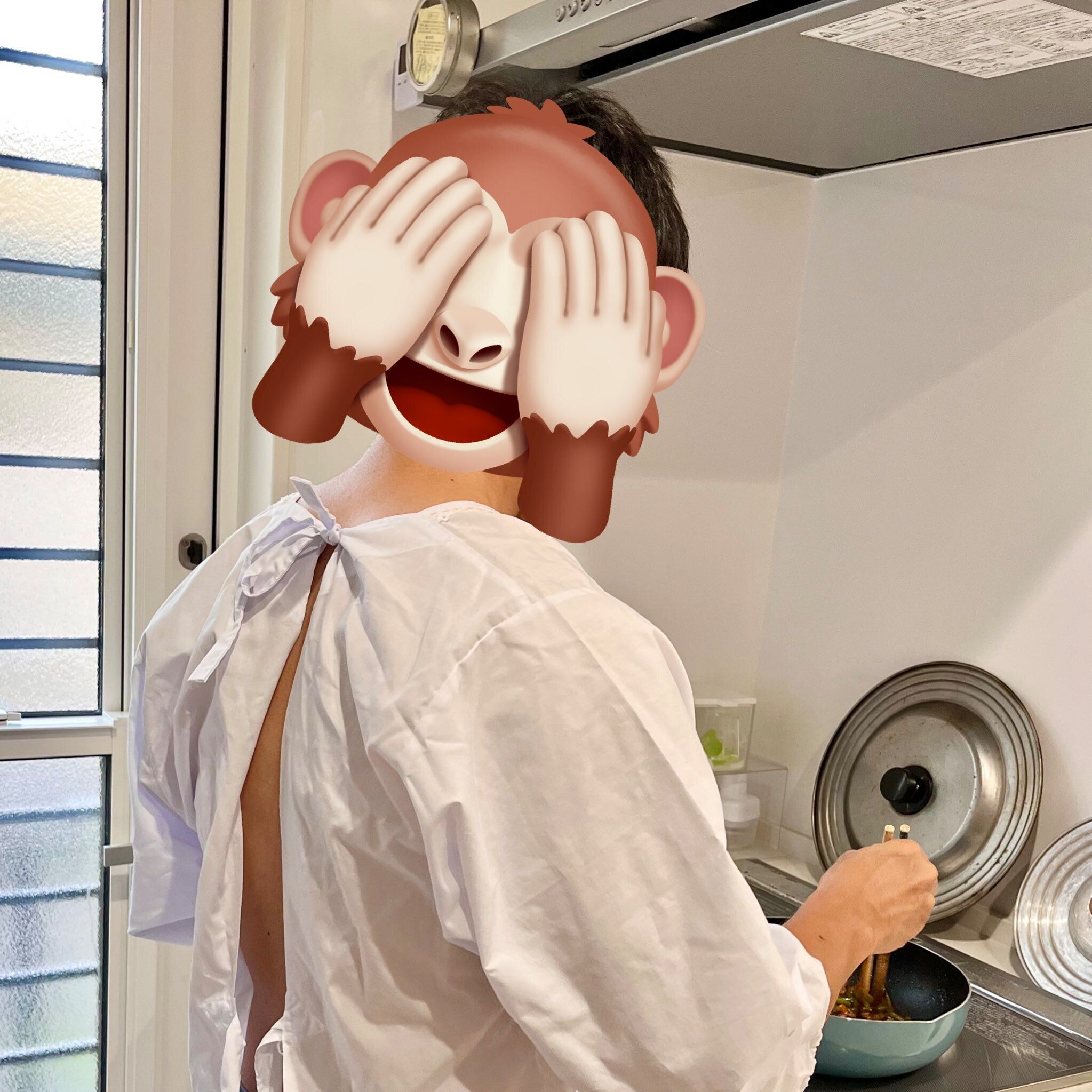 「ふだん料理は私の担当なのですが、この日は珍しく夫が料理を作ってくれることになりました。炒め物をしているときに、服に油が散っていることに気づき、汚さないために服を脱いだそうです(笑)そうすると当然ですが素肌に油が散るため熱くて困り、周囲を見渡すと私のかっぽう着があったので裸のまま着た、という流れです」