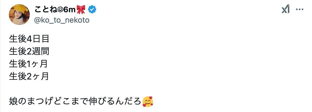 • ことね6mさんは、「娘のまつげどこまで伸びるんだろう」というコメントをつけて、生後4日目から2ヶ月まで合計4枚の写真をXに投稿しました。