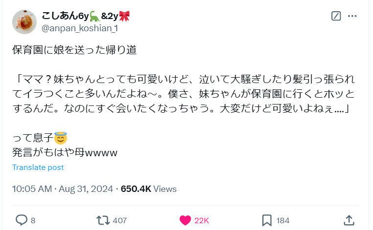 こしあん6y&2yさん(@anpan_koshian_1)が投稿したのは息子と一緒に歩いていたときの発言です。妹に対する思いを教えてくれたのですが、その発言がまさに母親だったそう。妹への愛が伝わる発言に2.2万件のいいねが集まりました。