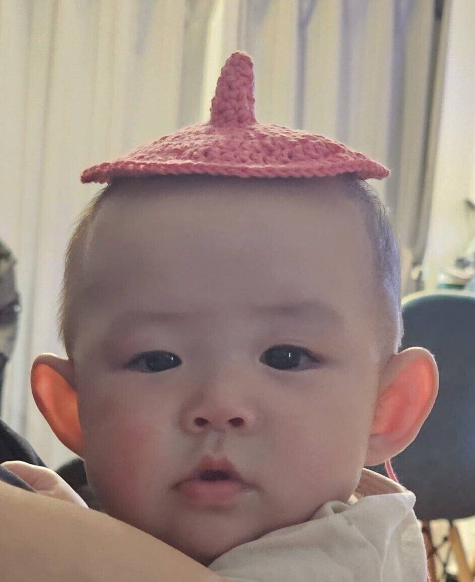 マアム8m(4/9)さん(@uiro1595)が投稿したのは、当時4カ月の娘のために作った帽子。どんぐり帽子を作ろうとしたそうですが、途中の段階ではまさに茶碗蒸しの蓋のよう。その帽子と、帽子を被る娘の様子に「かわいすぎる」の声が集まりました。