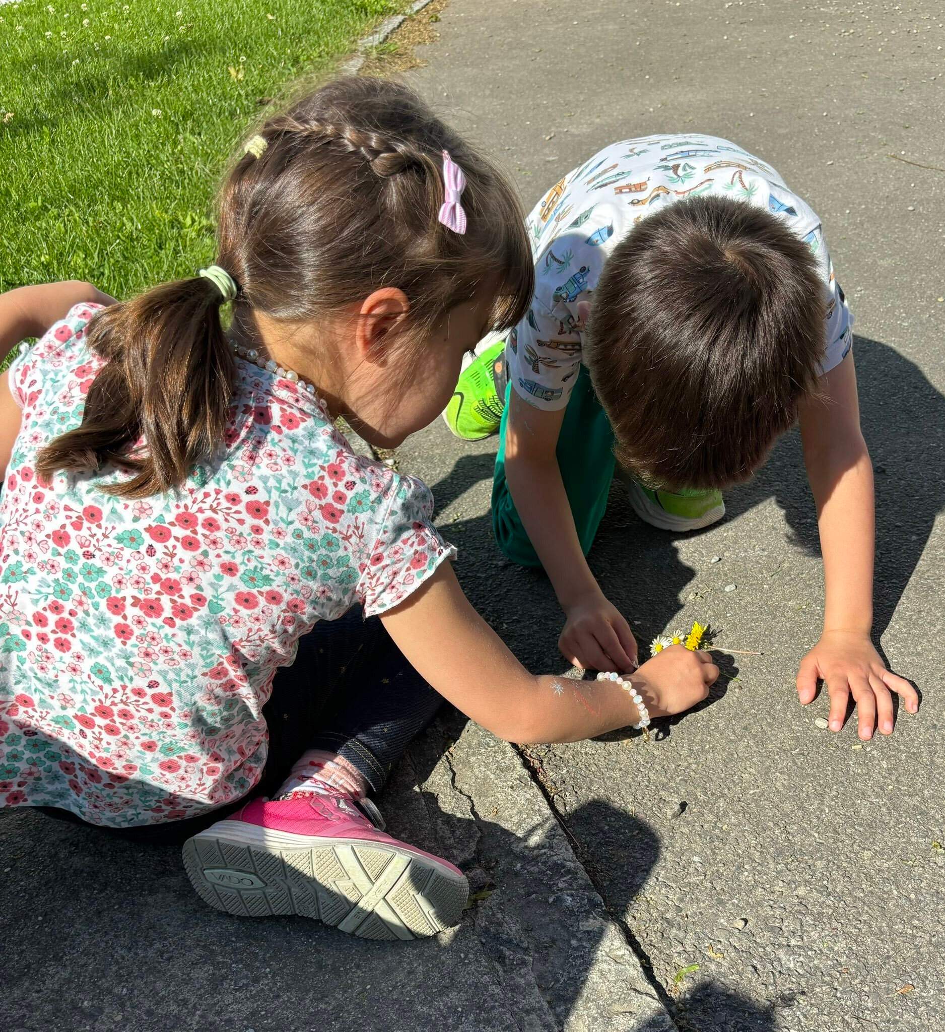投稿にはお子さんたちが、摘んだ花をミツバチの周りに並べている様子も公開されていました。地面に手や膝をつき、ミツバチが元気になるよう一生懸命行動している様子が伝わってきますね。