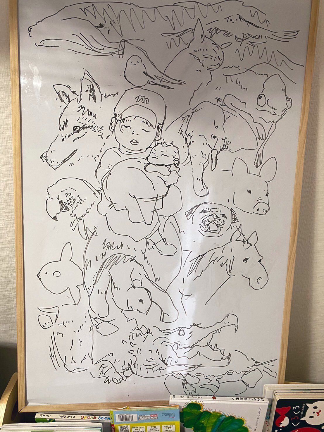 こちらは『むしゅことむしゅめ&アニマルズの落書き』。まだ赤ちゃんである妹を抱っこした息子さんを、イヌやネコ、鳥、ウマ、ゾウ、カメ、ワニなどさまざまな動物が囲んでいます。こちらの動物のクオリティもまた素晴らしすぎます。