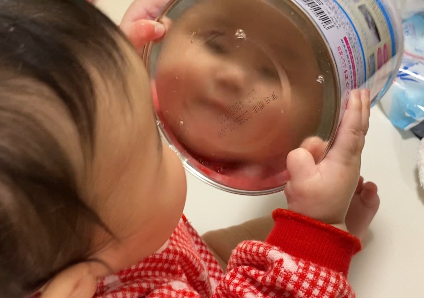 「何を見ているんだろう?」ミルク缶の底を見つめる9カ月の娘。赤ちゃんだからこそ発見した尊すぎる世界に9.6万人が胸キュン!