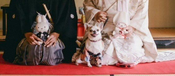 おまめちゃんも飼い主さんたちと同じく着物に身を包み、かわいらしく着飾っています。