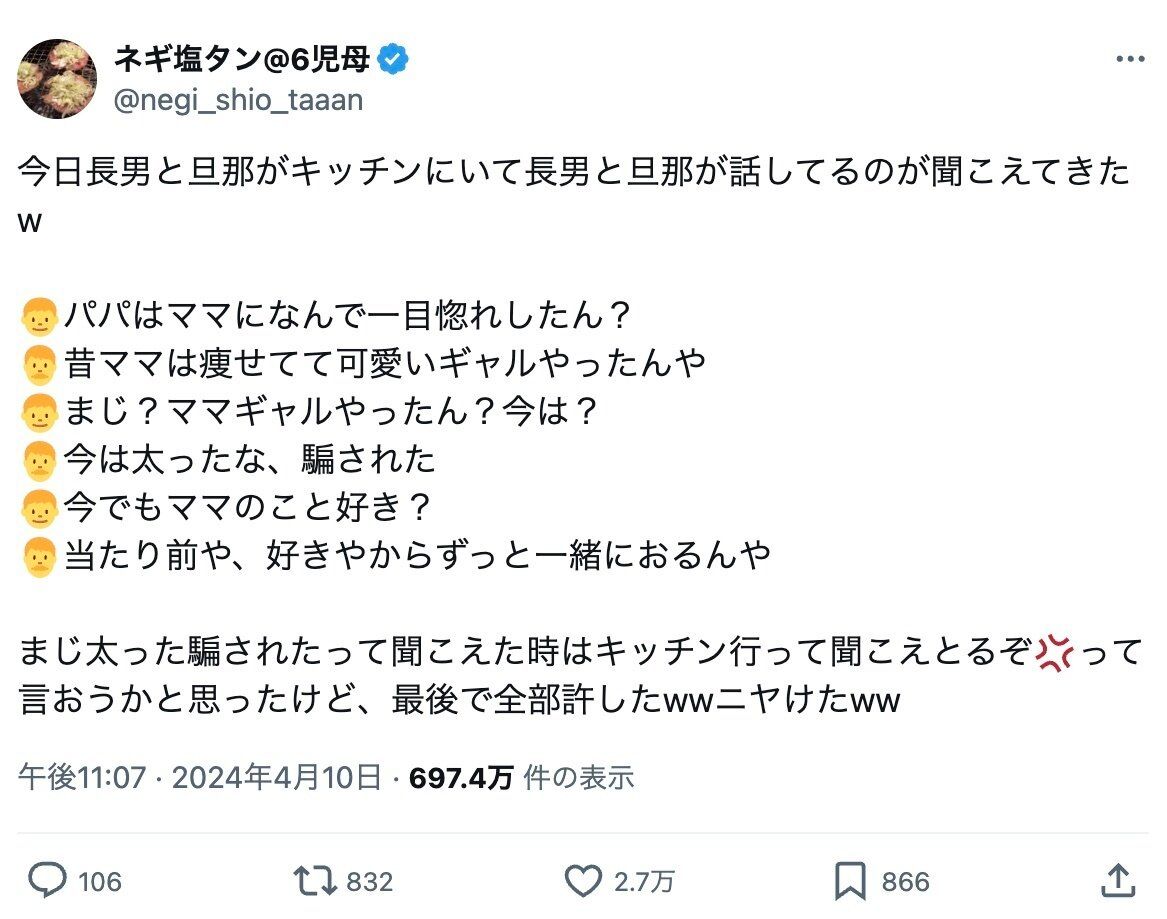 この投稿に、Xでは2.7万件のいいねと「息子くんファインプレー」「当たり前に当たり前って言うご主人最高」「心底惚れちゃっているということですね」といったコメントが集まり、パパの本音に感動する人が続出しました。