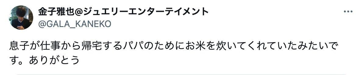 金子雅也@ジュエリーエンターテイメントさん(@GALA_KANEKO)の投稿が話題になっています。投稿したのは、当時2歳の息子くんが、パパのために炊いてくれたお米の写真。Xでは、「優しさが詰まった味がしそう」と5.6万人が感動しました。