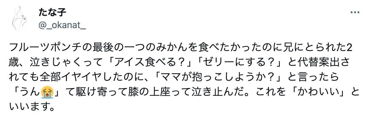 2歳の息子くんは、最後に残ったみかんを食べたかったそうなのですが、お兄ちゃんに食べられてしまい、泣き出してしまいました。