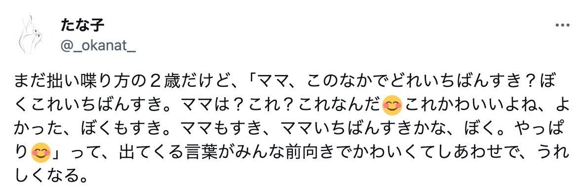 思わず「かわいい!」がこぼれてしまう2歳の息子くんのエピソード。ママのみならずXで多くの人を魅了しました。息子くんにはこれからも、豊かな心と表現力を育んで大きく成長していってほしいですね。